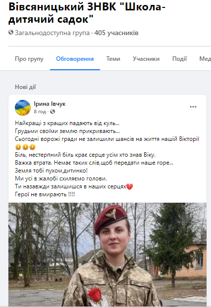 «Ворожі гради не залишили шансів на життя нашій Вікторії. Біль, нестерпний біль крає серце усім хто знав Віку. Важка втрата. Немає таких слів,щоб передати наше горе...Земля тобі пухом,дитинко!Ми усі в жалобі схиляємо голови. Ти назавжди залишишся в наших серцях. Герої не вмирають, — написала 21 березня на сторінці Вівсяницький ЗНВК «Школа- дитячий садок» Ірина Івчук