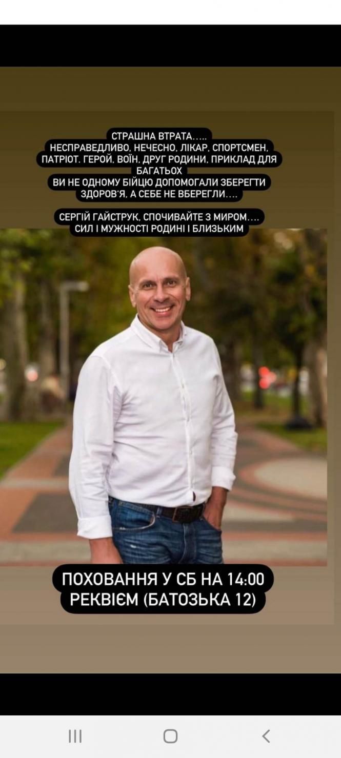 «У велике церковне свято, в день Сорока святих мучеників, на 63-му році життя, нас покинув капітан ЗСУ, голова медичної частини батальйону «Дністер» — Сергій Анатолійович Гайструк.