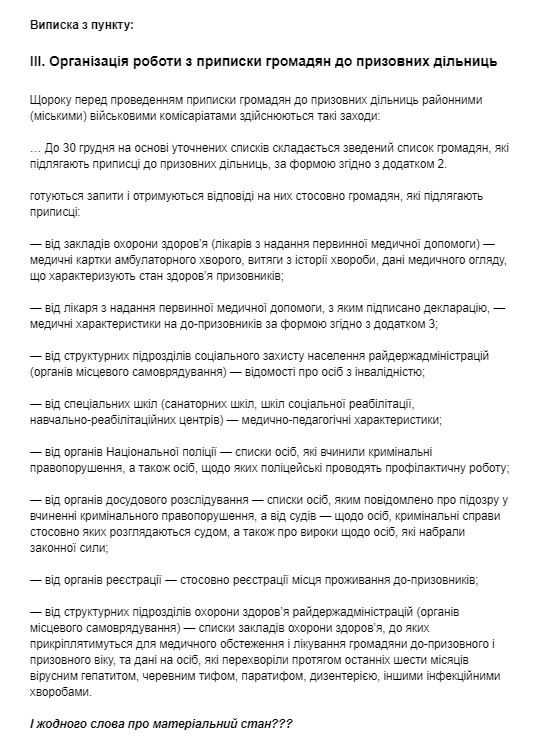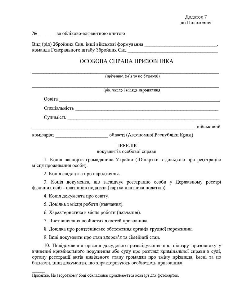 Вказаним положенням затверджений вичерпний перелік документів, які можуть складатися у військкоматі і які необхідні для вивчення призовника та постановки його на облік. Перелік відомостей, які вказані в документах, не підлягає розширеному тлумаченню. Всі документи, які не відповідають офіційно затвердженим бланкам — це самодіяльність Міноборони.