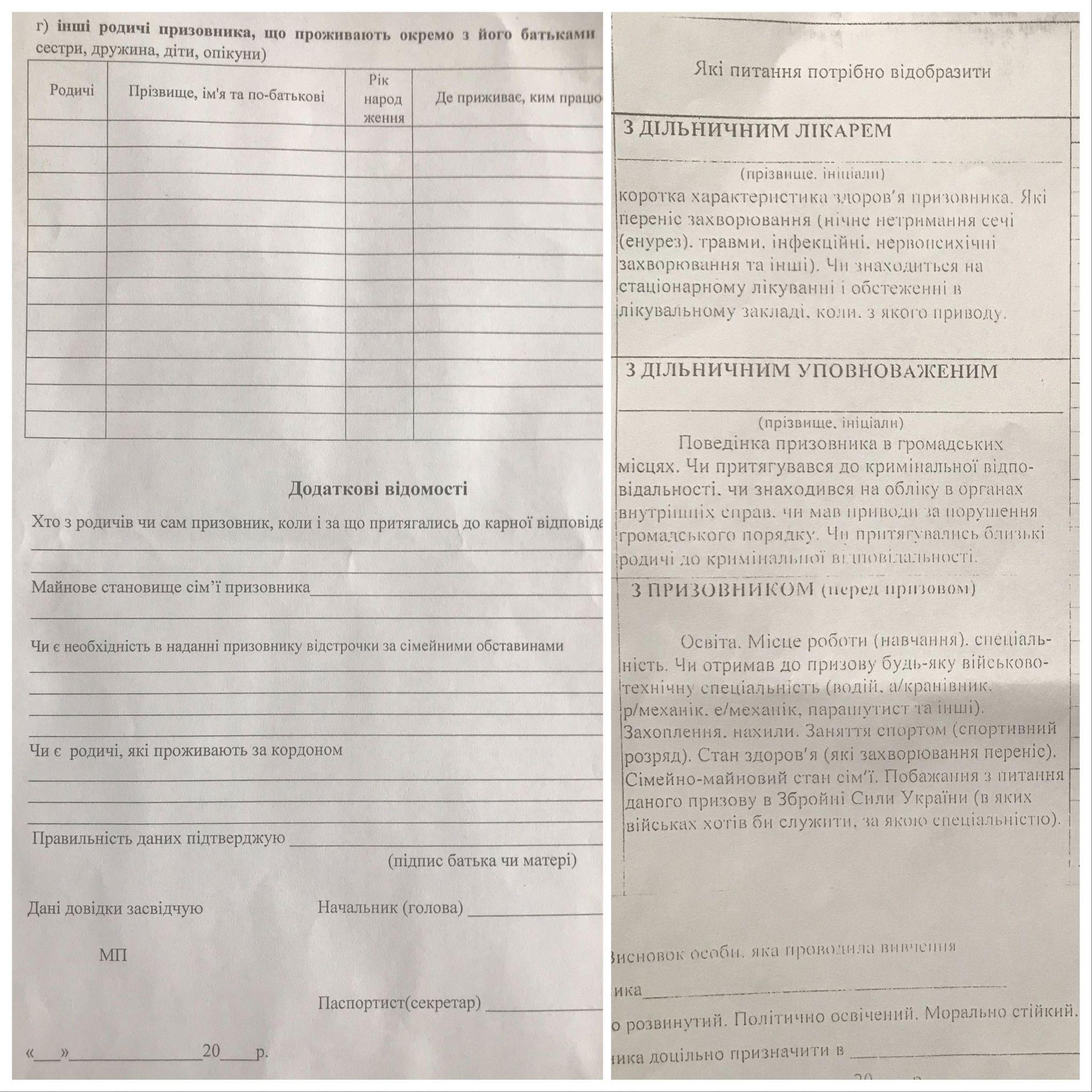 Окрім особистих даних призовника та його батьків, потрібна інформація від дільничного лікаря, від дільничного уповноваженого та від керівника навчального закладу. Тут все ясно. Але яка користь військкомату в інформації про оклад (середній заробіток чи пенсію) матері й тата? Навіщо армії знати матеріальний стан сім’ї? І яку цінність несе інформація про родичів, які проживають і які не проживають разом з батьками призовника, при чому з поміткою, де проживають і ким працюють?