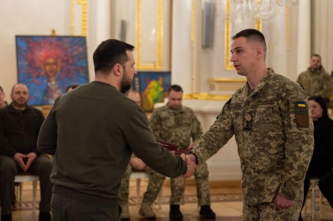 8 лютого 2024 року. Маріїнський палац. Церемонія вручення найвищих державних нагород. Поруч — Головнокомандувач ЗСУ Валерій Залужний та керівник ГУР Кирило Буданов. Серед нагороджених — командир дивізіону ППО В’ячеслав Агеєв.