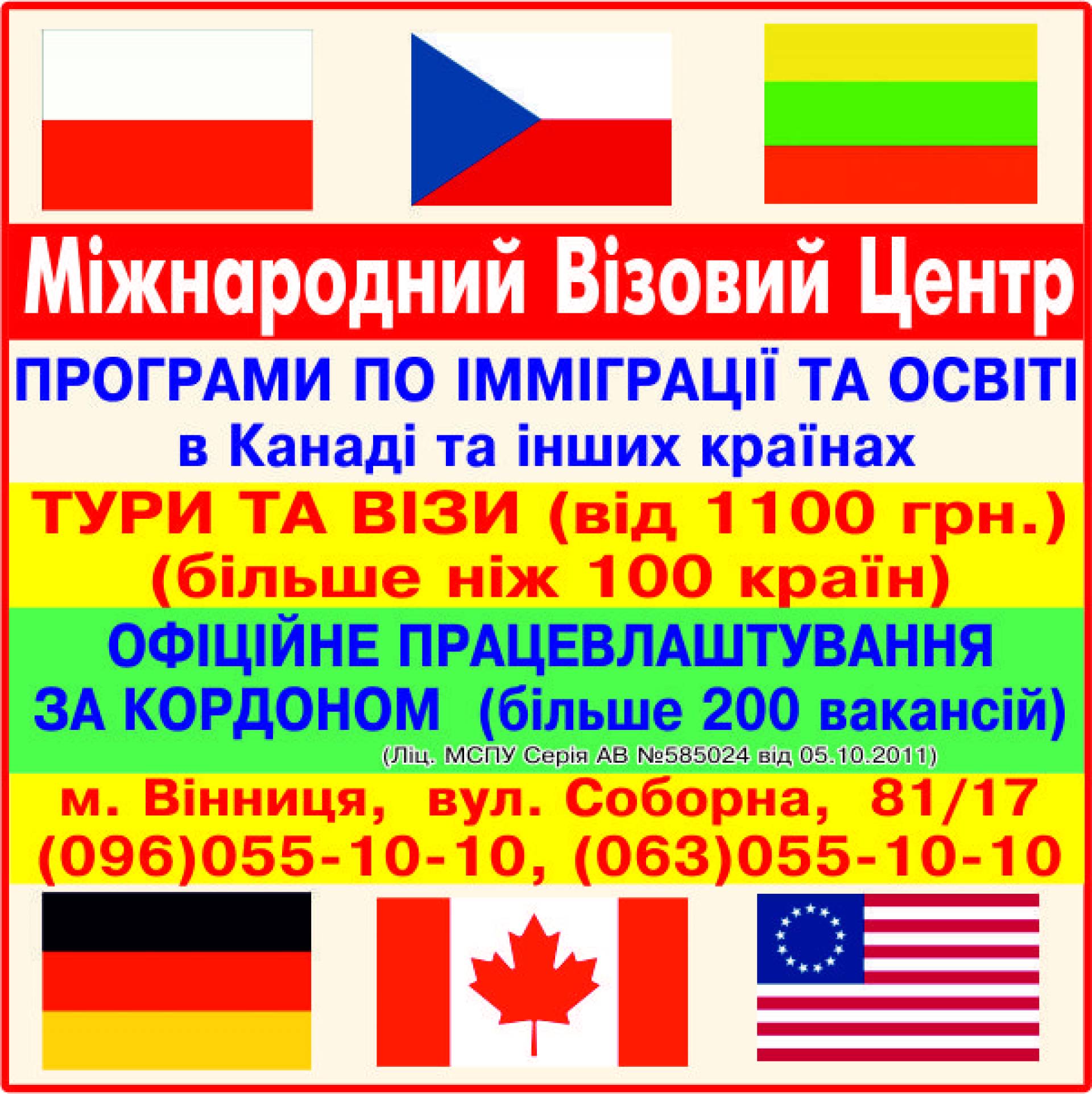 ТОВ «Міжнародний Візовий Центр» займається тільки легальним працевлаштуванням і пропонує роботу в таких країнах як: Польща, Литва, Словачина а також роботу для студентів в США, Німеччині, Болгарії. Також займаємось оцінкою шансів на імміграцію, працевлаштування та освіту в Канаді.