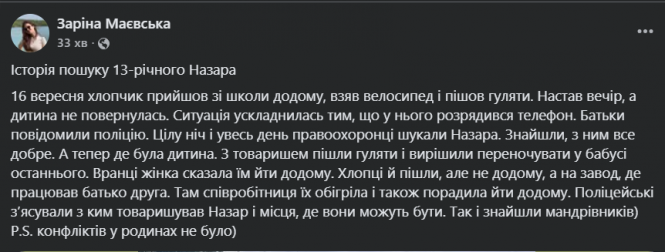 Зрештою, поліцейські знайшли хлопців і передали Назара батькам. Як зазначила речниця, жодних конфліктів у родині не було, а зникнення стало просто результатом дитячої «пригоди»