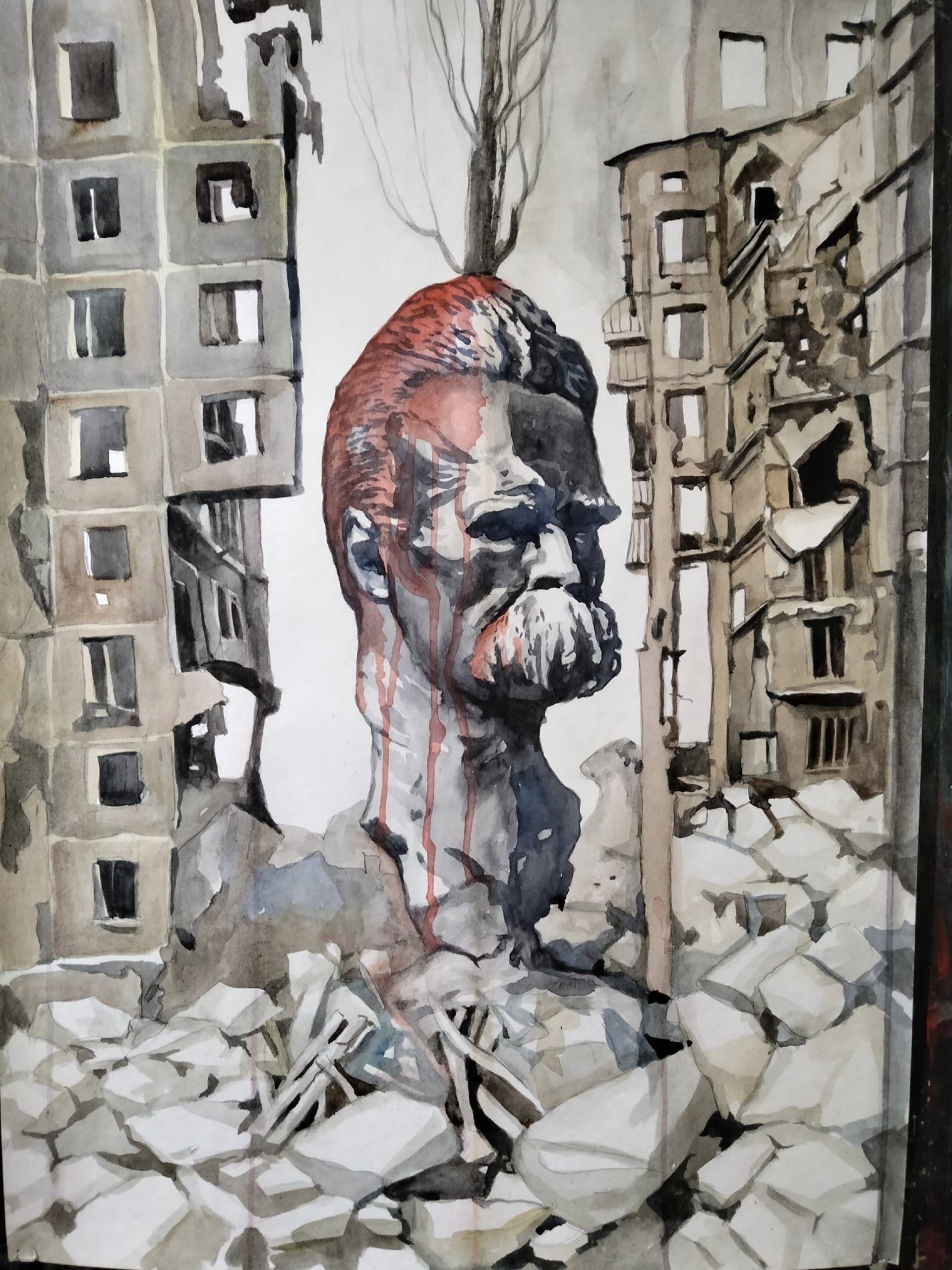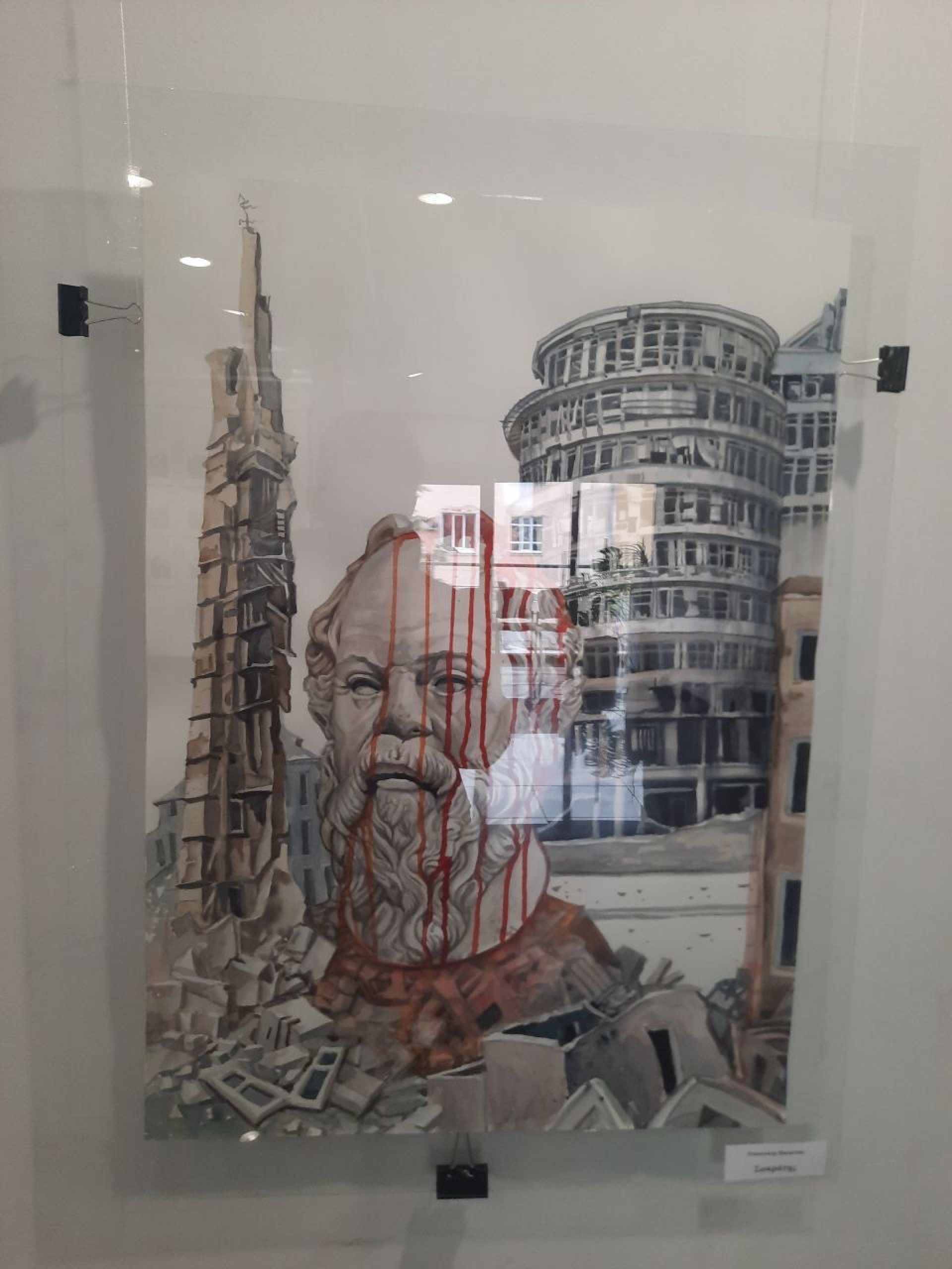 — Я просто уявив всіх ключових філософів світу залитими кров'ю. Їхні філософські та гуманітарні вчення не вберегли нас від чергової війни. Це ніби людство поливає кров'ю їхню думку, воно не зрозуміло, що з цього світу досить вже агресії. За останні кілька тисяч років внаслідок війн загинуло понад три мільярди людей. Але, вочевидь, декому й цього замало, — міркує художник. — Усі намагаються зняти з себе провину, адже напала саме росія. Та нам все одно варто замислитися над своїми вчинками, недостатньою увагою, що її ми приділяли важливим подіям, слабкою громадянською позицією. Ми всі тією чи іншою мірою винні в тому, що зараз відбувається.