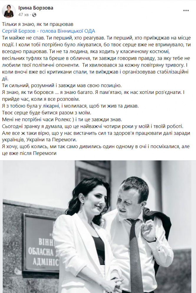 «Тільки я знаю, як ти працював. Ти майже не спав. Ти перший, хто реагував. Ти перший, хто приїжджав на місце події. І коли тобі потрібно було лікуватися, бо твоє серце вже не втримувало, ти всеодно працював. Ти не та людина, яка ходить у класичному костюмі, весільних туфлях та бреше в обличчя, ти завжди говорив правду, за яку тебе не любили твої політичні опоненти. Ти хвилювався за кожну повітряну тривогу. І коли вночі вже всі критикани спали, ти виїжджав і організовував стабілізаційні дії. Ти сильний, розумний і завжди мав свою позицію. Я знаю, як ти боровся … я знаю багато. Я пам’ятаю, як нас хотіли роз’єднати. І прийде час, коли я все розповім. Я з тобою була у лікарні, і молилася, щоб ти жив та дихав. Твоє серце буде битися разом з моїм. Мені не потрібні часи Ролекс ) і ти це завжди знав. Сьогодні зранку я думала, що це найважчі чотири роки у моїй і твоїй роботі. Але все ж таки вірю, що у нас вистачить сил та здоров’я працювати далі заради українців, України та Перемоги. Я хочу, щоб колись, ми так само дивились один одному в очі і посміхалися, але це вже після Перемоги».