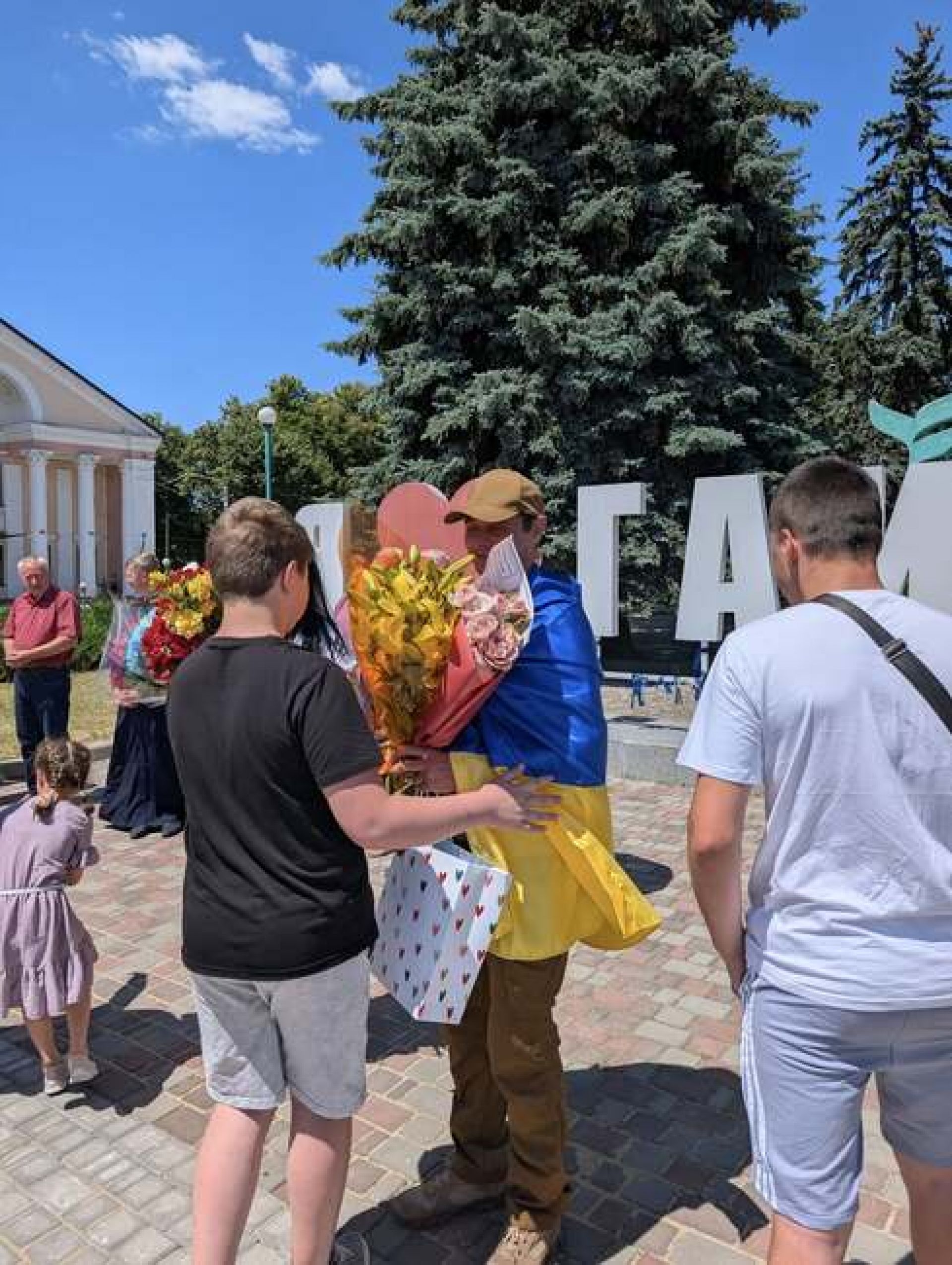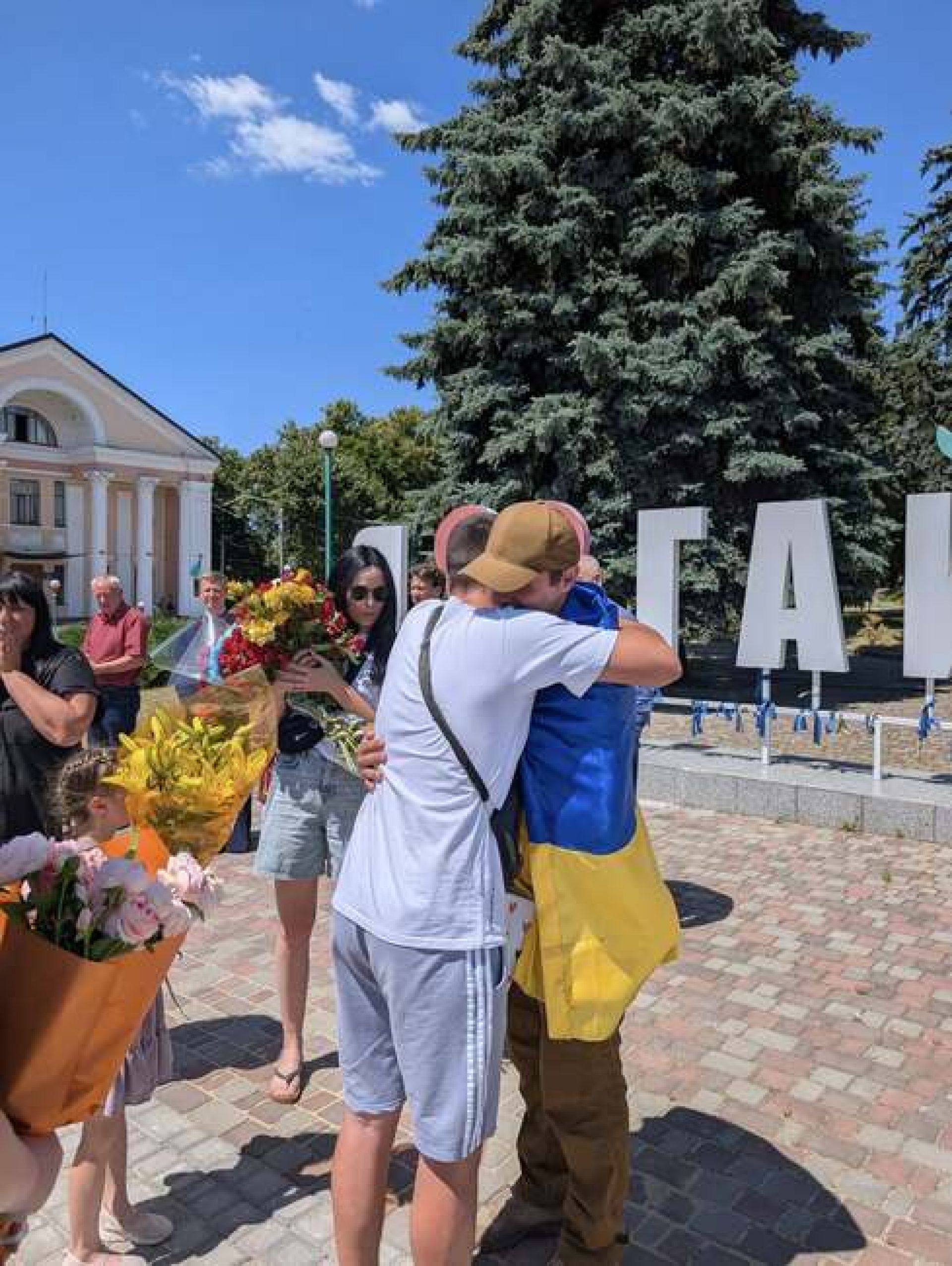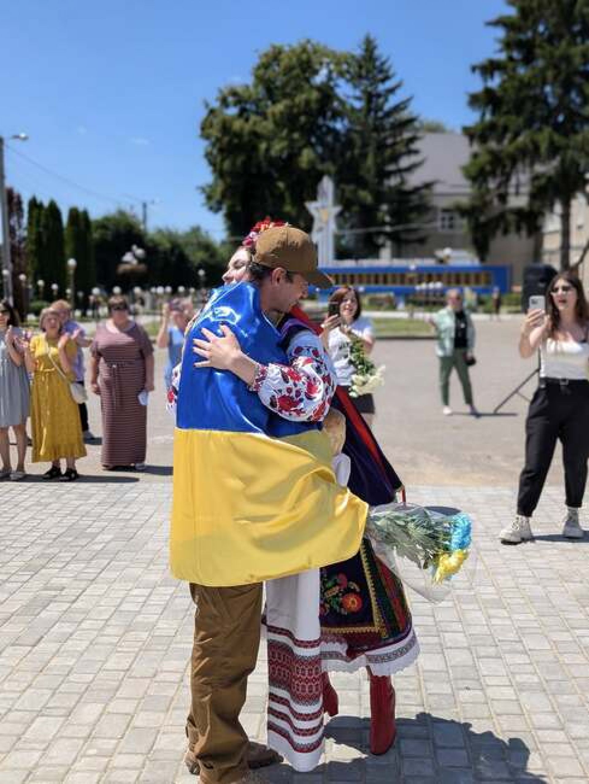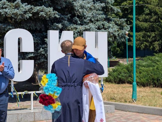 Міський голова Анатолій Гук на центральній площі міста вручив хліб на українському рушнику, український прапор та квіти, привітавши з поверненням на рідну землю і побажавши найшвидшого освоєння до цивільного життя на свободі у квітучій Україні.
