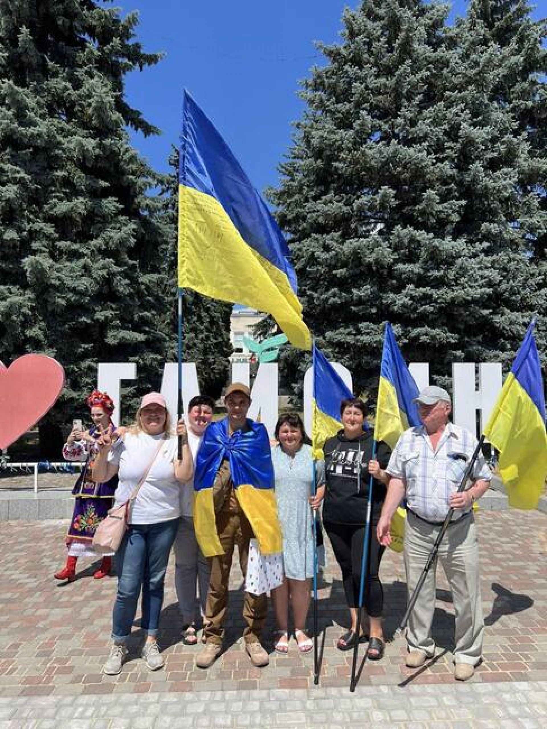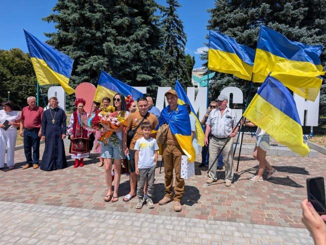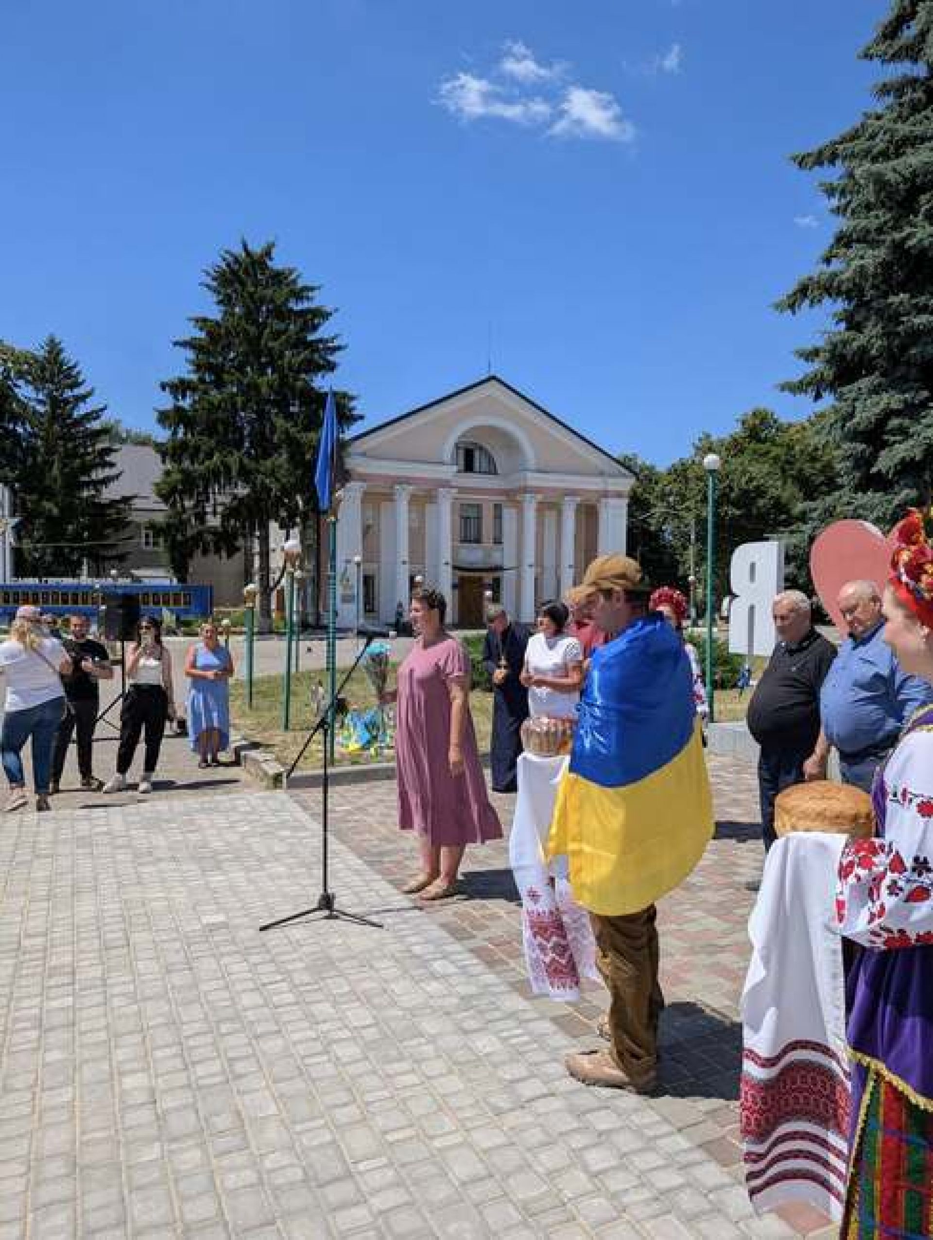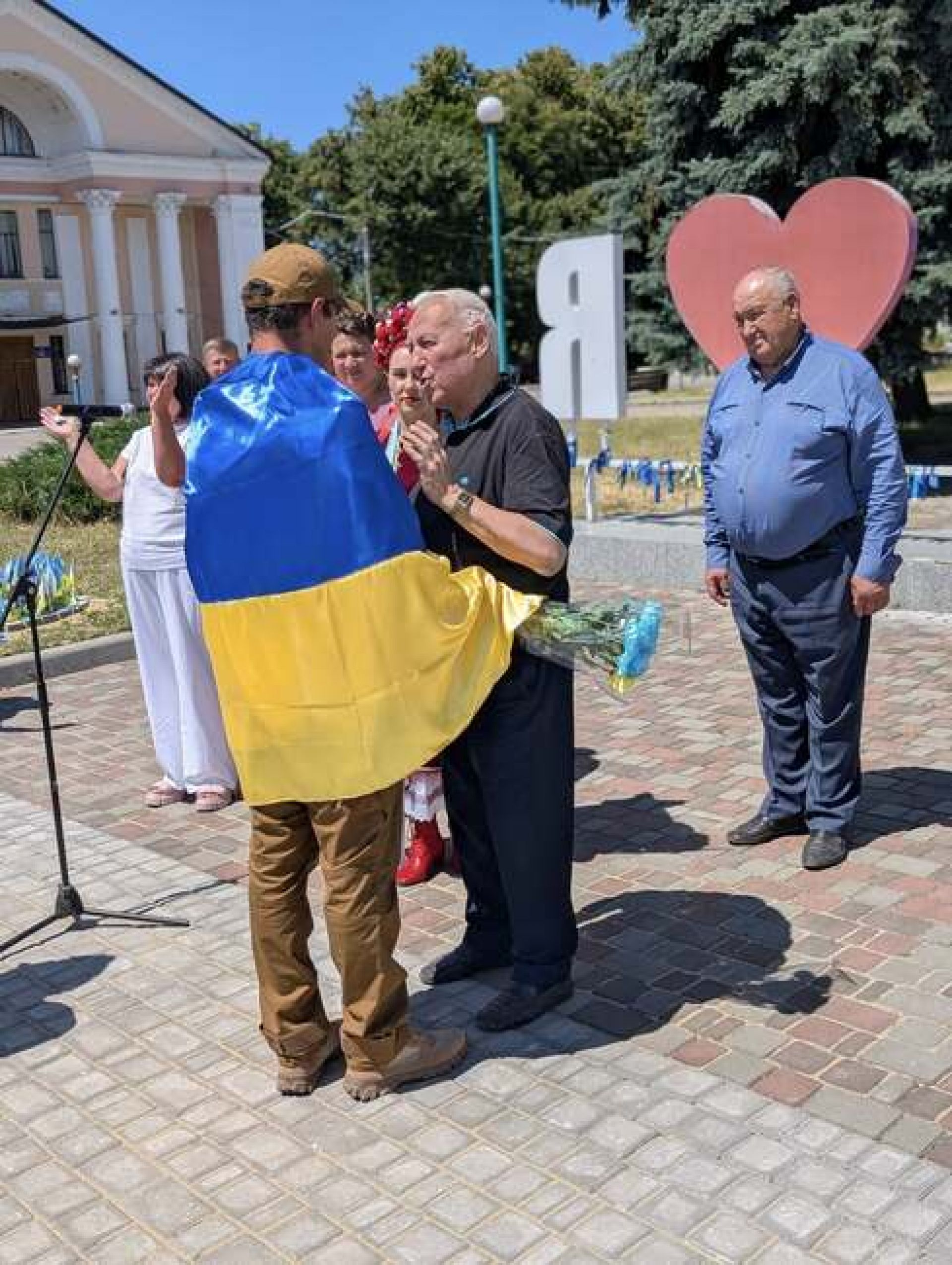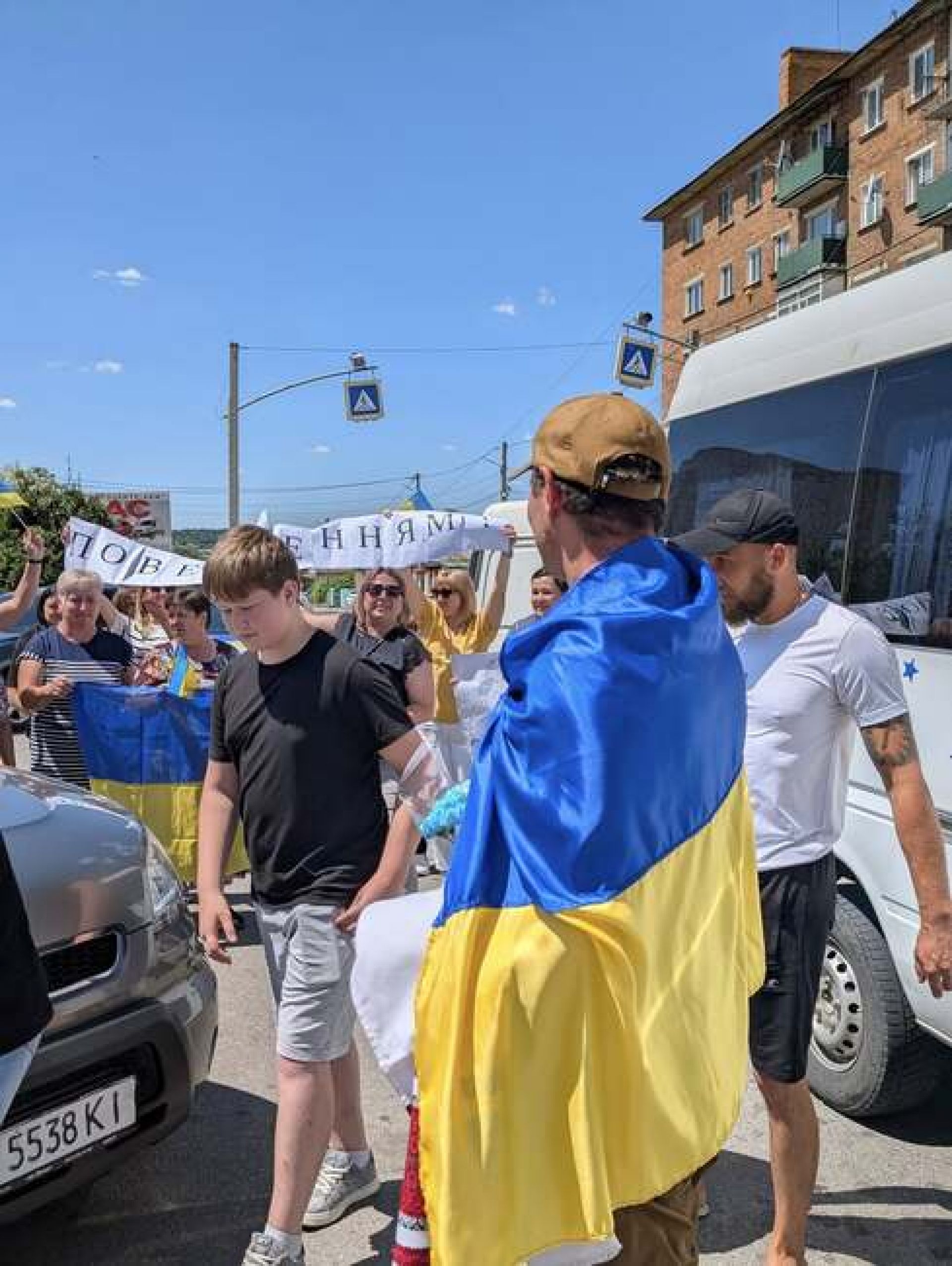 Міський голова Анатолій Гук на центральній площі міста вручив хліб на українському рушнику, український прапор та квіти, привітавши з поверненням на рідну землю і побажавши найшвидшого освоєння до цивільного життя на свободі у квітучій Україні.