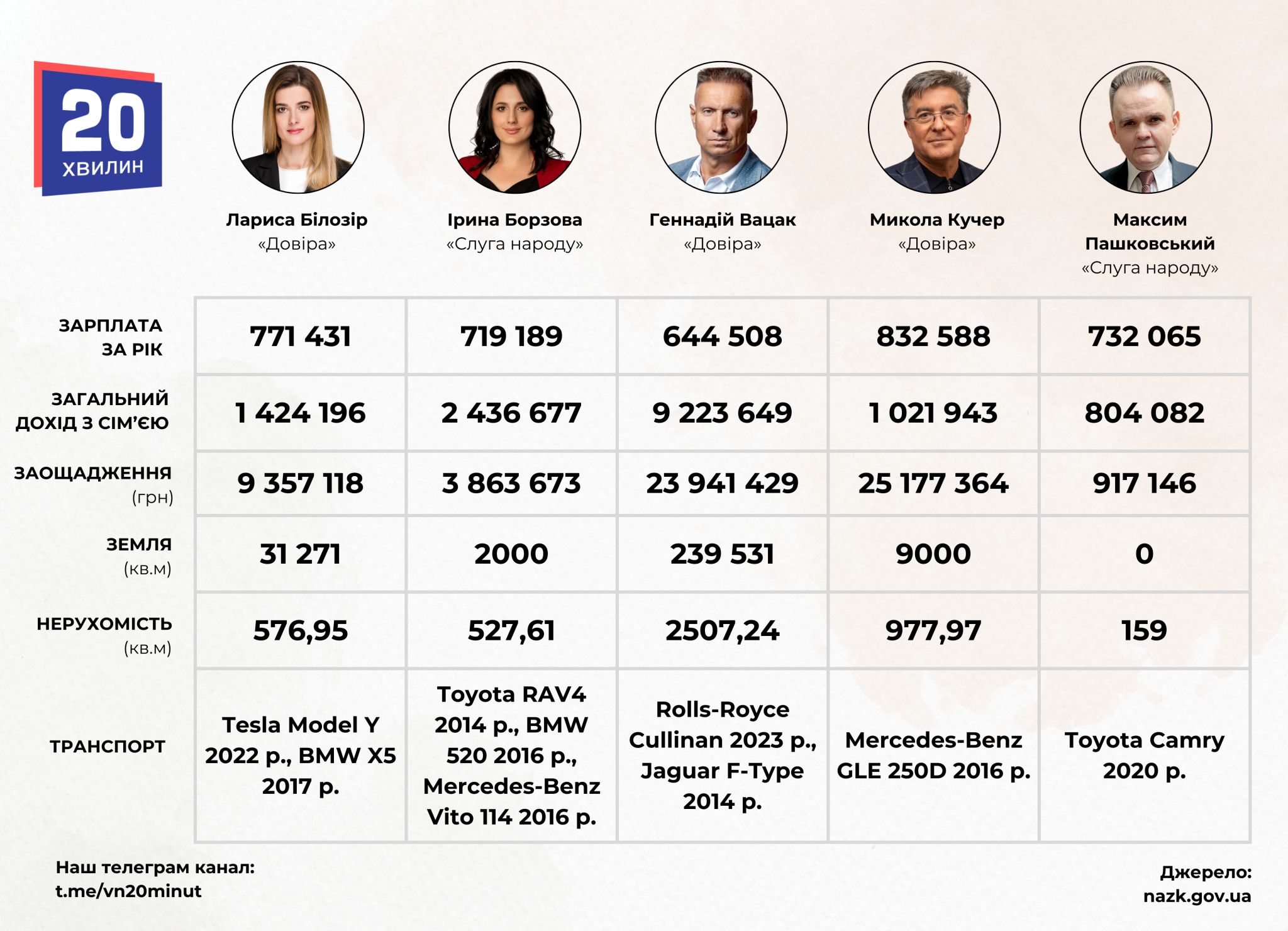 Найменші заощадження — у Юлії Овчинникової (1,29 млн грн) та Максима Пашковського (917 тис. грн).