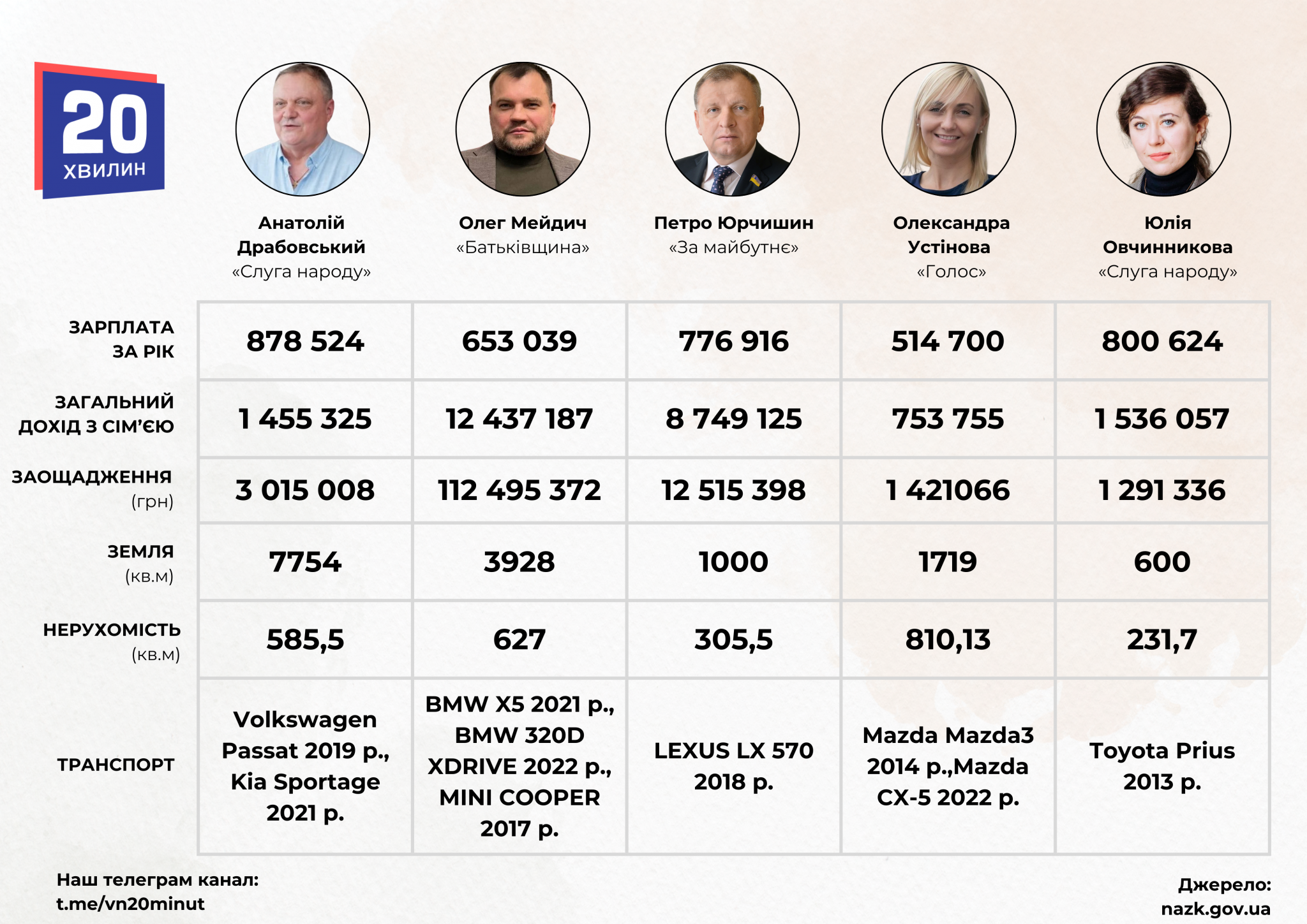 Найвищу задекларовану зарплату серед вінницьких нардепів отримав Анатолій Драбовський («Слуга народу») — 878 тисяч гривень за рік. Дещо менше в Миколи Кучера («Довіра») — 832 тисяч та у Петра Юрчишина («За майбутнє») — 776 тисяч грн.