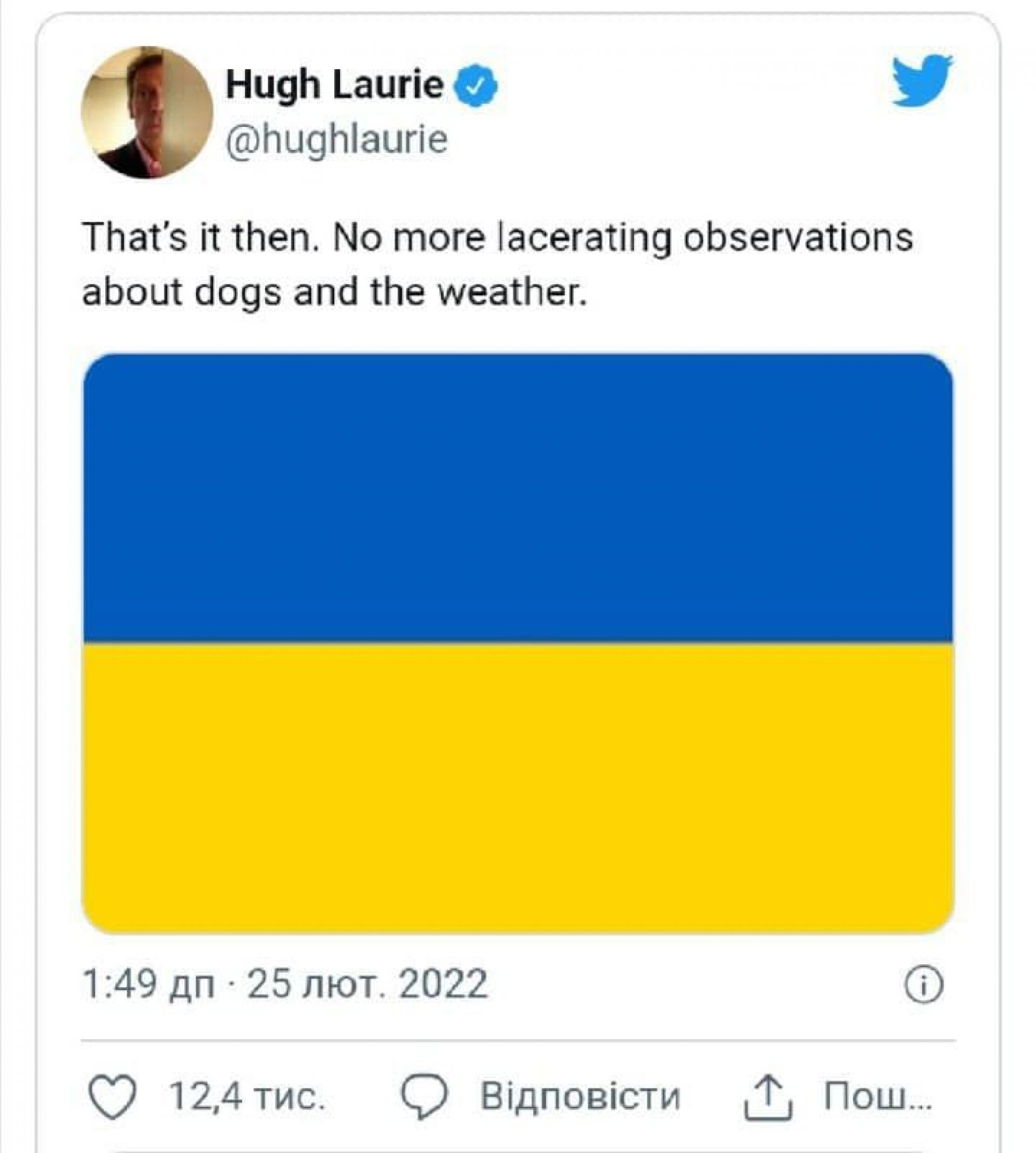 У кожного своя потужна зброя і кожен з нас може допомогти нам всім вистояти. Ми всім серцем віримо у нашу героїчну армію і у нашого сталевого Президента. Але будь-яка людина, яка навіть не знає, як перезаряджати рушницю, може своїми діями врятувати сотні людей — знайшовши їх, нагодувавши, розмістивши в себе. Перераховуючи гроші на потреби армії і тилу. Протидіючи російській пропаганді та розповідаючи світу про те, що нас, мирних жителів суверенної країни, зараз вбиває російська армія. Україна сьогодні — приклад відчайдушної боротьби за людяність, за своє право жити на своїй землі. Ми на передовій боротьби світу з безумовним злом. Гинуть тисячі безневинних людей. Гинуть діти, палають школи та дитсадки. І ми потребуємо всієї допомоги світу. Але в першу чергу — ми, як ніколи, потребуємо один одного. Слава народу України!