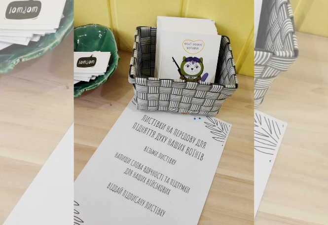 — Це турбота про військових. У трьох місцях Вінниці є чудові листівки, які кожен охочий може підписати. Потім все буде відправлено нашим героям на передову, — розповідає організаторка цього проєкту Оксана. — З молодіжним центром ми домовилися, що підписані листівки ми будемо вкладати у сформовані їхніми волонтерами сухпайки. Таким чином кожен воїн отримає не просто їжу, а й моральну підтримку.