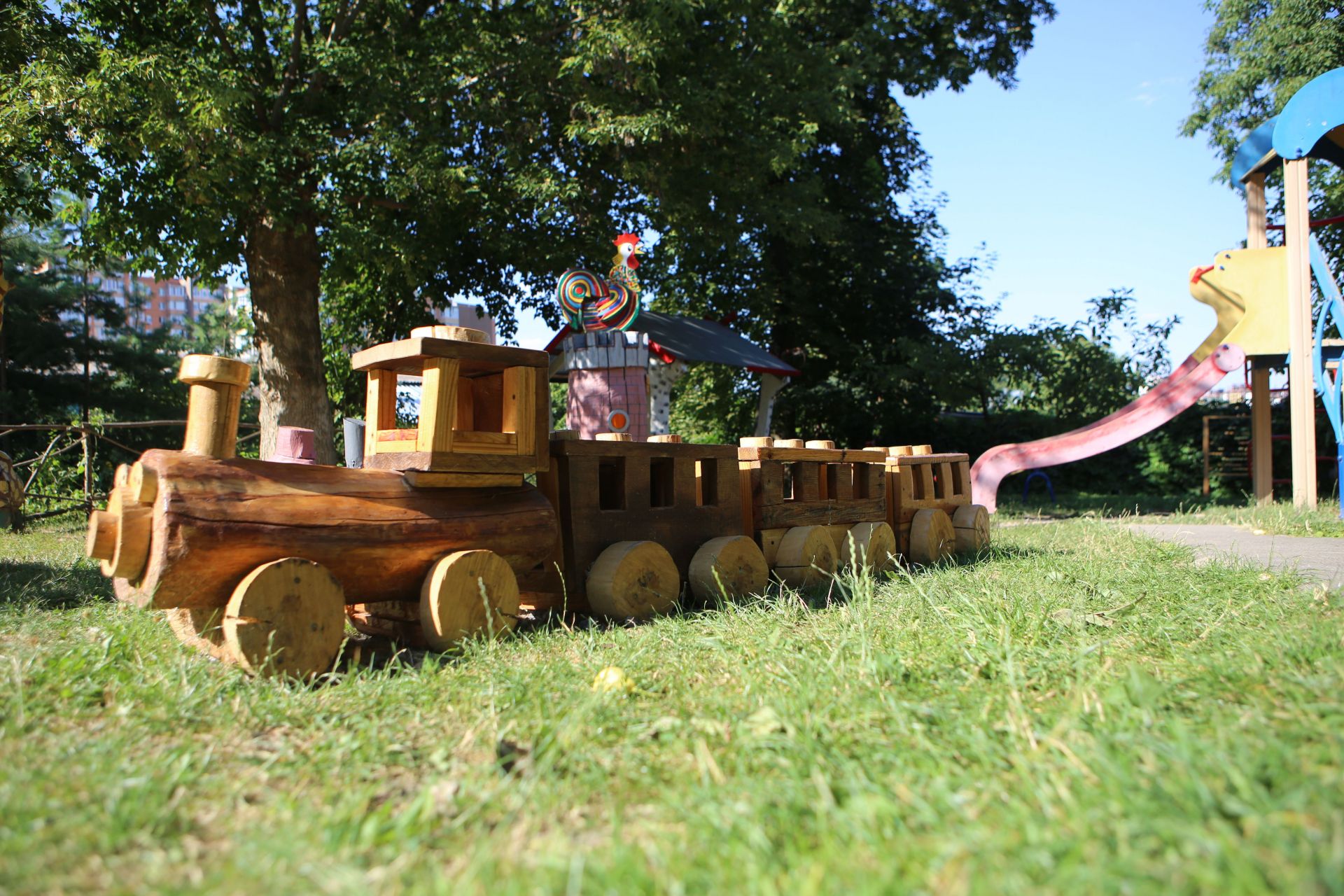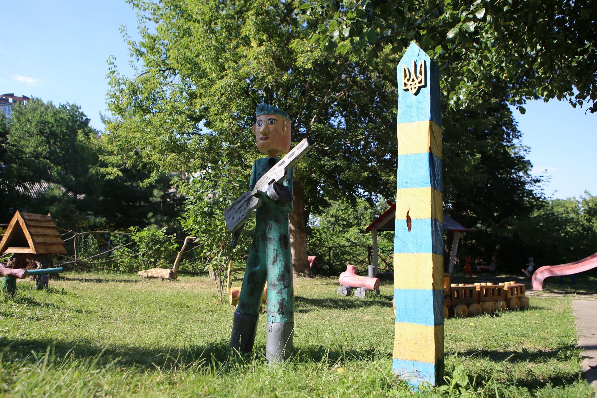 — У нас тут все аматорське, — розповідає Любов. — Колекцію свою ми постійно поповнюємо. Ось, наприклад, зробили новий паровоз для дитячого майданчику. Щоб він не гнив, ми встановили його на щебінь, тільки діти чомусь закидають цей щебінь всередину вагонів. А ось це вуйки. На різні свята я одягаю їх у різні вбрання. Гарно ж виглядає, правда?