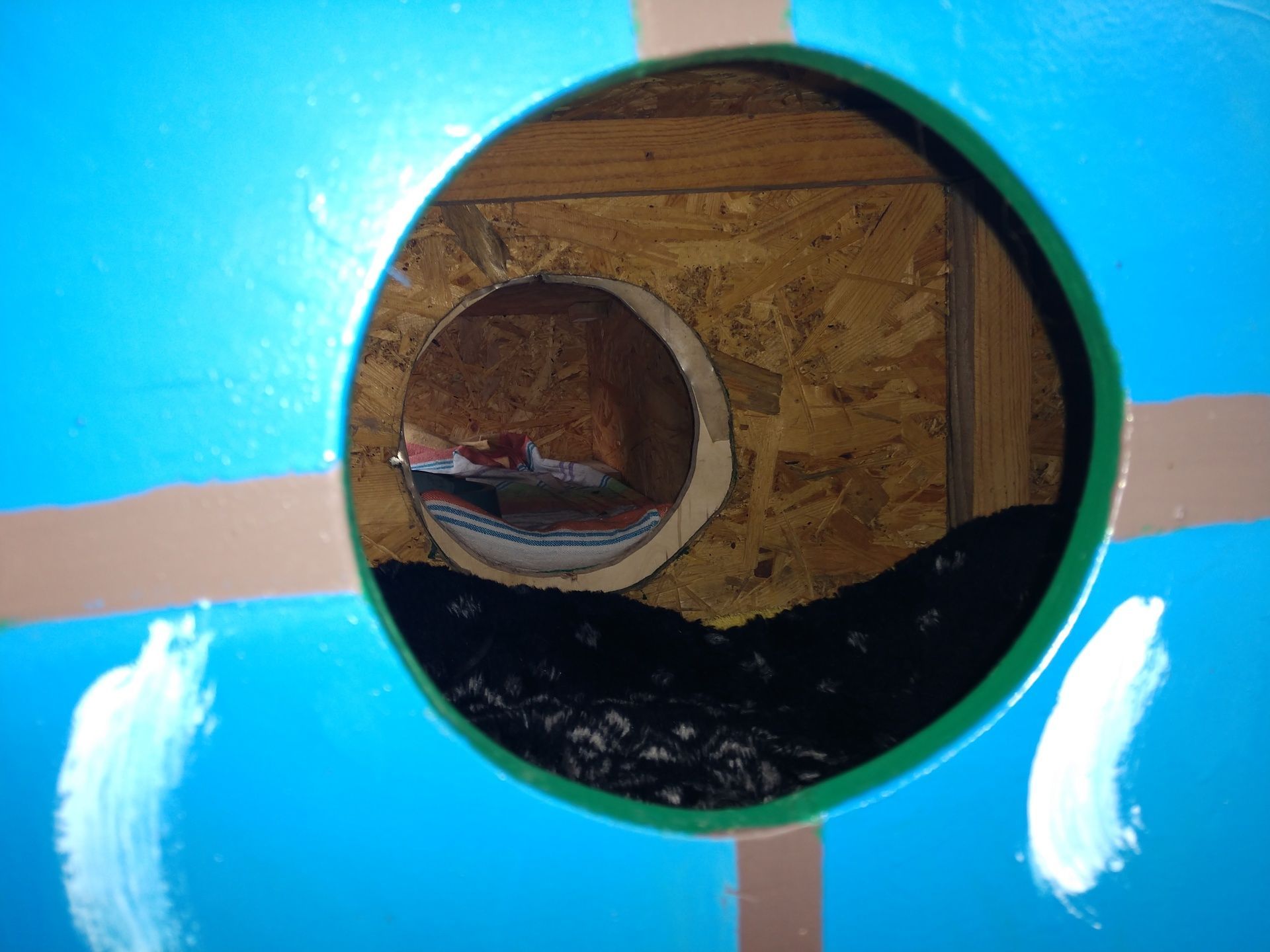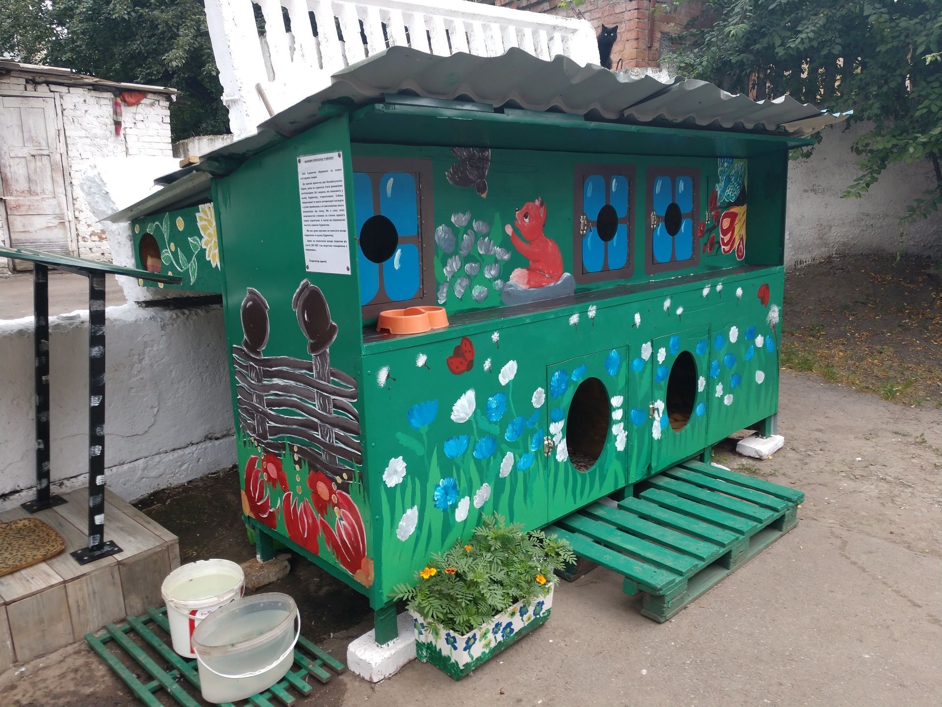 Це двоярусна споруда з деревини з’явилася тут завдяки Олександрі Романенко. Жінка говорить, що ідея створити будку для вуличних тварин виникла у неї після вибухів на Калинівських складах. Тієї ночі у підвалі її будинку з переляку розродилася собака. Сусіди винесли цуценят на вулицю. Дізнавшись про це, Олександра заховала їх за плитами в дальньому куті двора, де вони потім і зростали. Тоді ж у навколишніх будинках почали закривати підвали. Тепер на вулиці опинилися ще й коти.