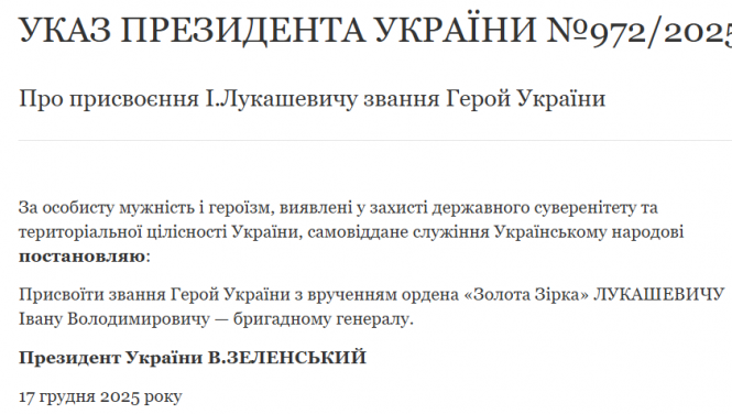 «За особисту мужність і героїзм, виявлені у захисті державного суверенітету та територіальної цілісності України, самовіддане служіння Українському народові постановляю: Присвоїти звання Герой України з врученням ордена «Золота Зірка» Лукашевичу Івану Володимировичу — бригадному генералу», — йдеться в Указі Президента.