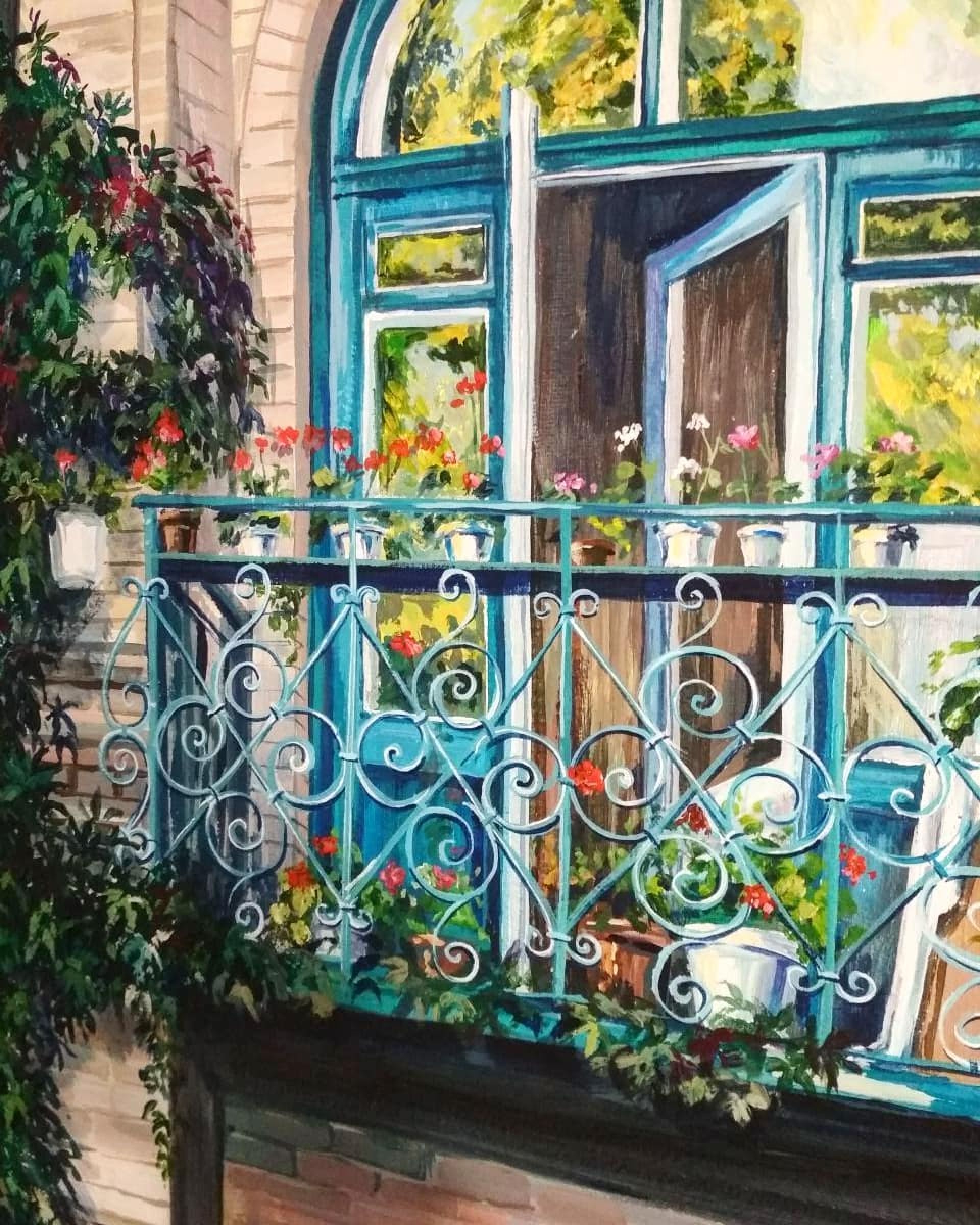 — В Європі навіть вікна не дозволяють перефарбовувати, а у нас прямо в центрі можна побачити, як один самостійно утеплився, іншій балкон добудував, а третій кондиціонер причепив. Також на Соборній дуже багато реклами, яка виглядає зовсім не гармонійно. Прикро на все це дивитися, — говорить художниця. — Поки що серед моїх робіт лише одна про Вінницю. Це балкончик, що на Пушкіна. Я фотографувала його ще років 5-6 тому, тож зараз він виглядає трішки інакше. Я дізналася навіть, хто там мешкає. Жінка, яка там живе часто вигулює тхорика. Іноді я приходжу туди, щоб подивитися на цей балкон, а ще мені хочеться покласти у поштову скриньку листівку з його зображенням.