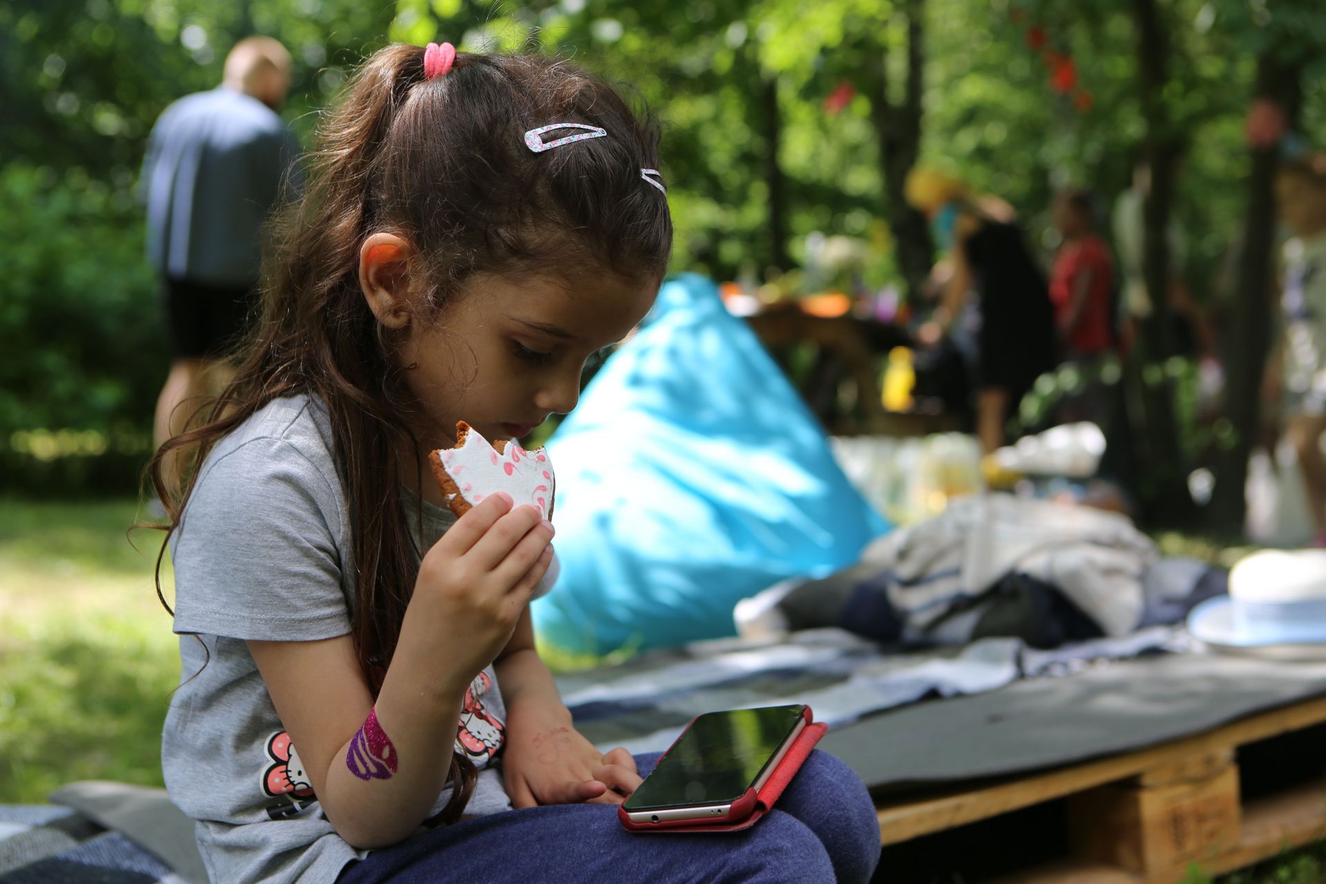 – Найцікавіше сьогодні було грати з аніматорами. Ще зробила собі два татуювання. Зараз піду і третє зроблю, – знімаючи маску, говорить усміхнена Віка. – Ось там моя сестра, а ось це моя мама…