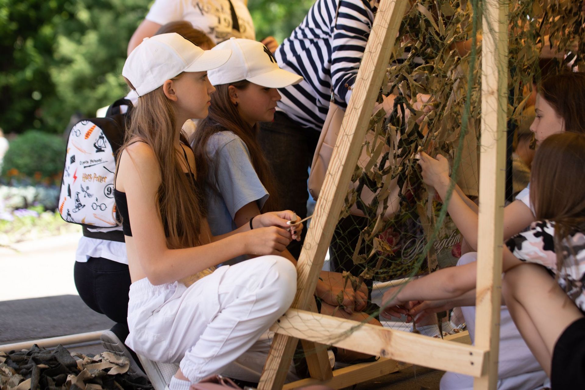 Тим часом у Центральному парку юні вінничани плели маскувальні сітки для наших захисників.