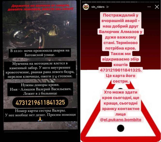 «Потрібна допомога! Вчора о 22.20 сталась аварія на Батозькій вулиці. У ній отримав тяжкі травми екс-боєць полку «A3OB» Алмазов Валерій Васильович. Наразі він бореться за життя в реанімаційному відділенні 2 лікарні, — цитуємо повідомленні. — Потрібне переливання крові, будь-якої групи. Здати кров на його ім'я можна у Вінницькому центрі переливання (Пирогова, 48). Не залишайтесь осторонь! Ваша допомога може врятувати життя».