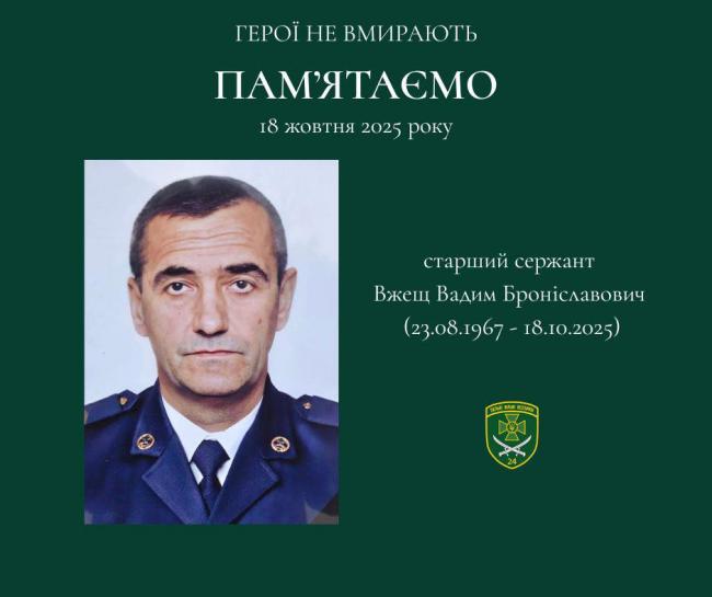 - Старший сержант Вадим Вжещ загинув під час виконання бойового завдання у Дніпропетровській області.