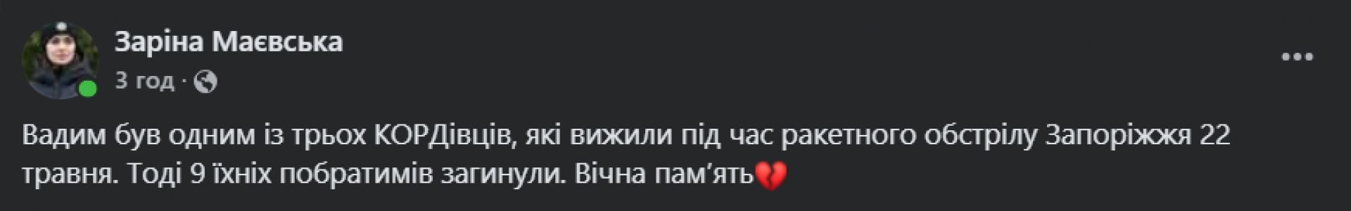 Поліцейська Заріна Маєвська у фейсбук написала: «Вадим був одним із трьох КОРДівців, які вижили під час ракетного обстрілу Запоріжжя 22 травня. Тоді 9 їхніх побратимів загинули. Вічна памʼять».