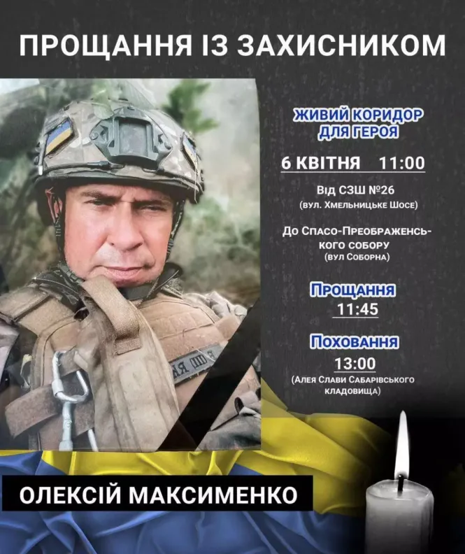 - Вінницька громада 6 квітня проводжає в останню путь Олексія Максименка.