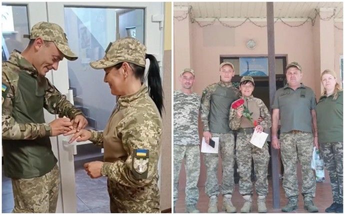 «Військовослужбовці Лариса та Олег познайомились п'ять років тому, почали жити спільно. Коли розпочалася повномасштабна війна, разом пішли захищати Батьківщину, щоправда потрапили у різні військові частини. Лариса служить у 210-му батальйоні 120-ї окремої бригади Сил ТрО ЗСУ, а Олег в 47-й ОМБр. Довгі місяці розлуки підштовхнули військовослужбовців до такого серйозного кроку й от днями вони офіційно поєднали свої долі», — йдеться у повідомленні.