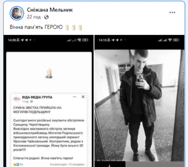 — Сьогодні вночі російські окупанти обстріляли Сумщину та Чернігівщину. Внаслідок обстрілу загинув військовослужбовець Могилів-Подільського прикордонного загону молодший сержант Ярослав Чайковський. Контрактник, родом з Котюжанської громади. Йому було всього 20 років, — йдеться у дописі.