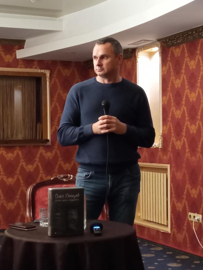— Дякую всім, хто прийшов, сьогодні я вперше у Вінниці, — сказав Олег Сенцов після привітання і вступного слова модераторки зустрічі Катерини Калитко. — Я не вважаю себе якимось особливим, кращим, ніж будь-яка інша людина, яка була на Майдані, чи виборювала нашу свободу в Криму, були в АТО чи досі перебуває там. Я їм дуже вдячний за це, тому що це дійсно люди, які творять нашу сучасну Україну, а я просто один із них.