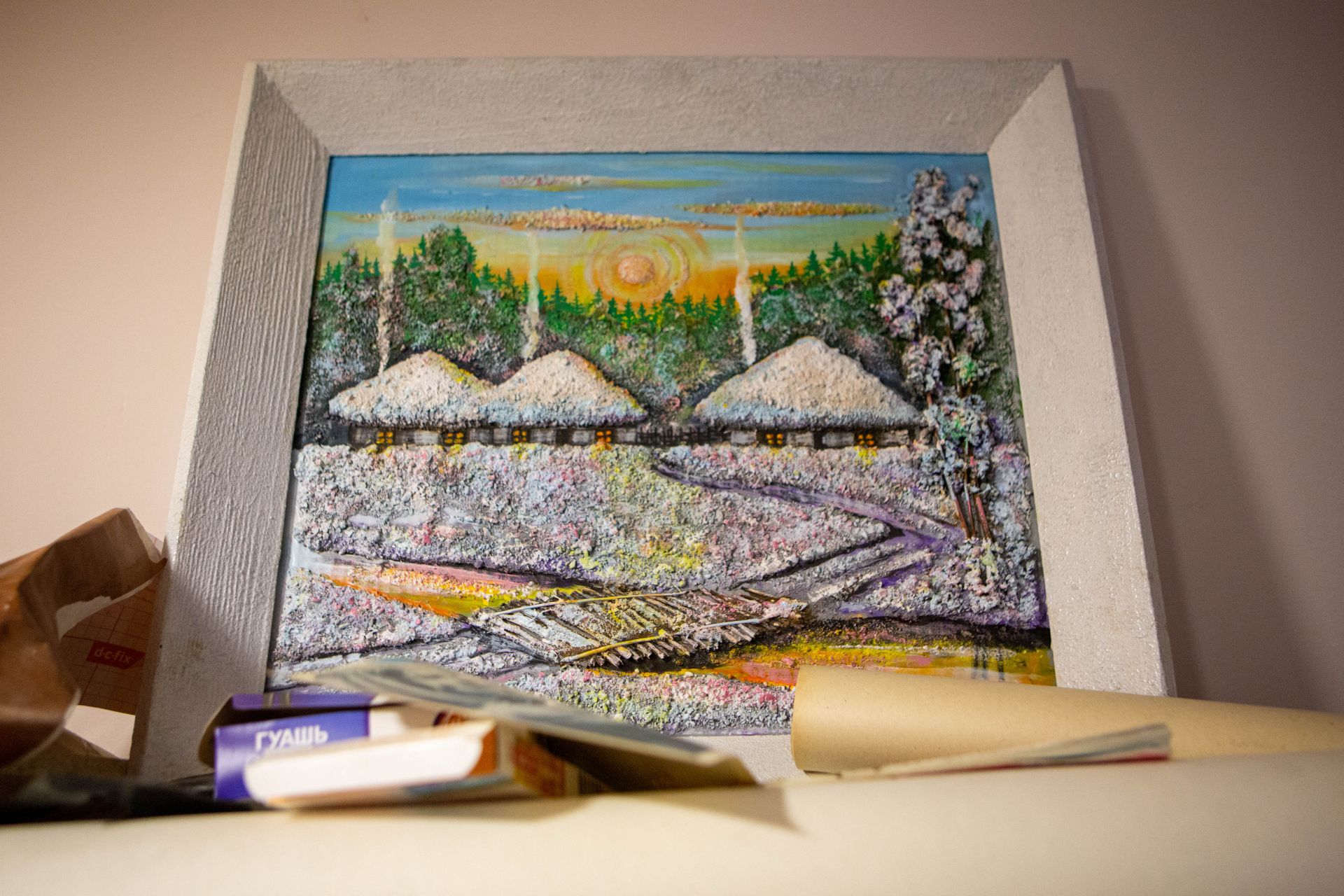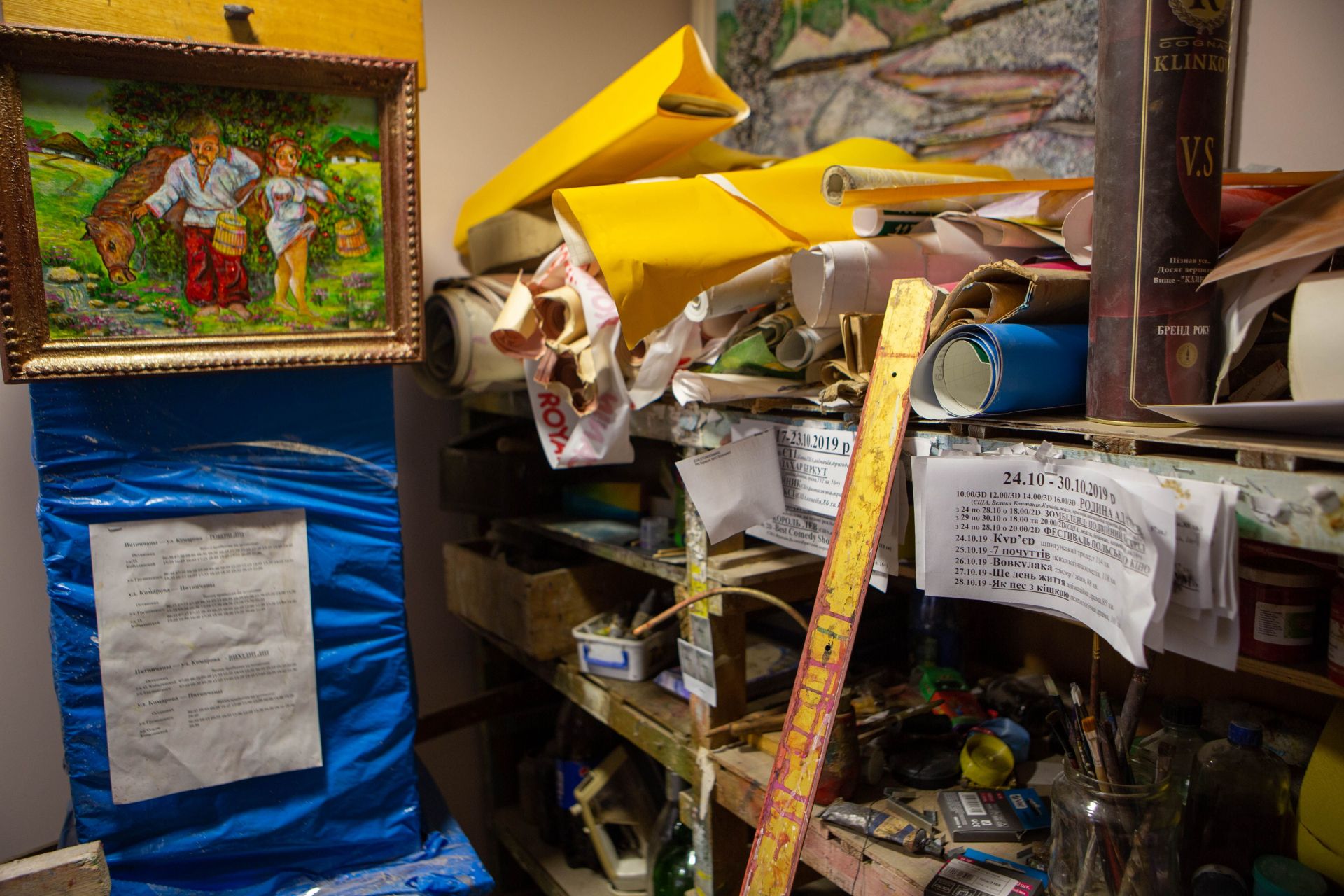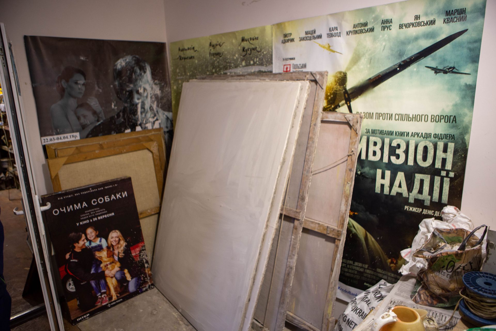 Майстерня художника знаходиться на другому поверсі кінотеатру «Родина». Над величезним мольбертом зі стелі світять дві лампи, стіл на стелаж заставлені баночками з фарбами та малярними кісточками.