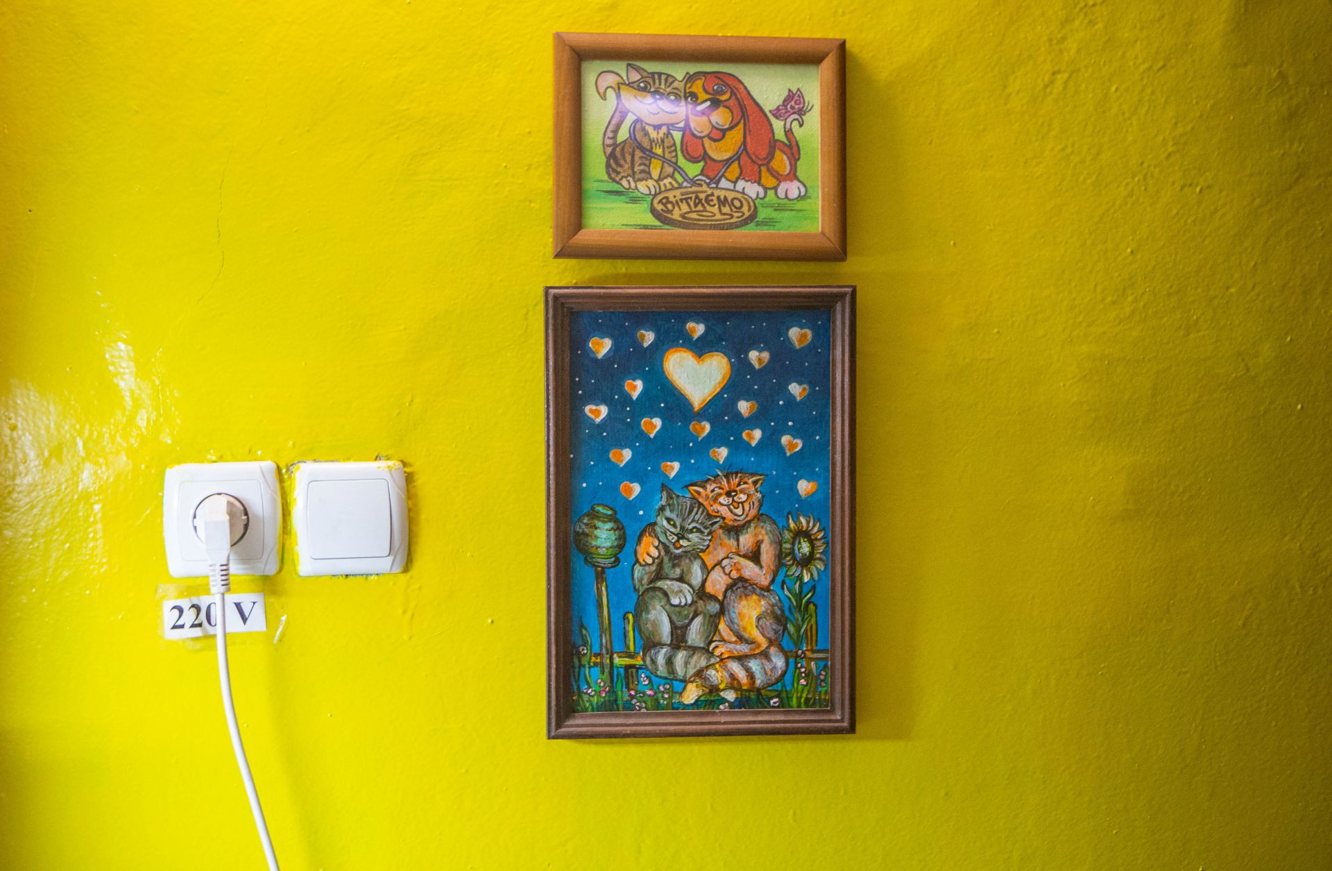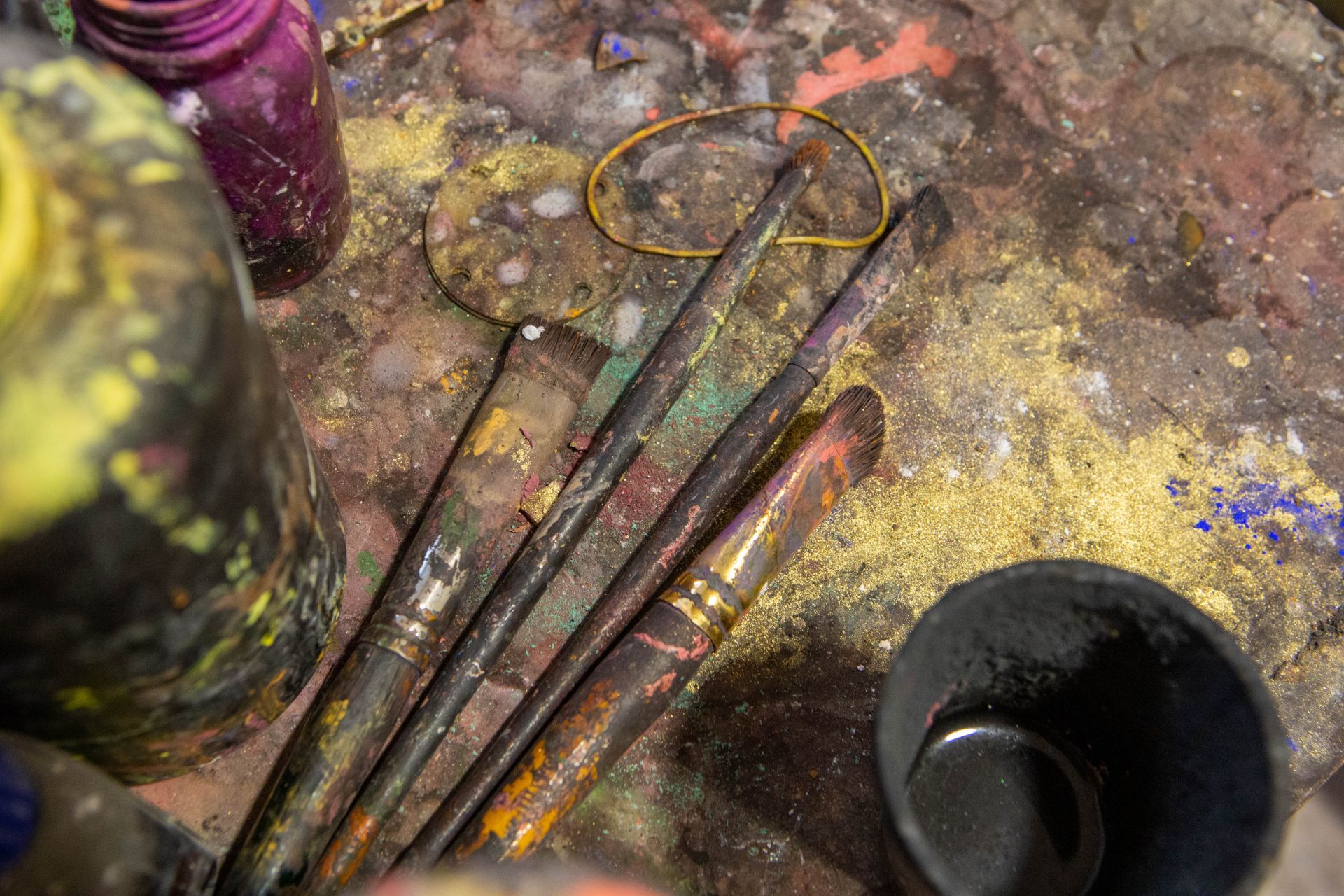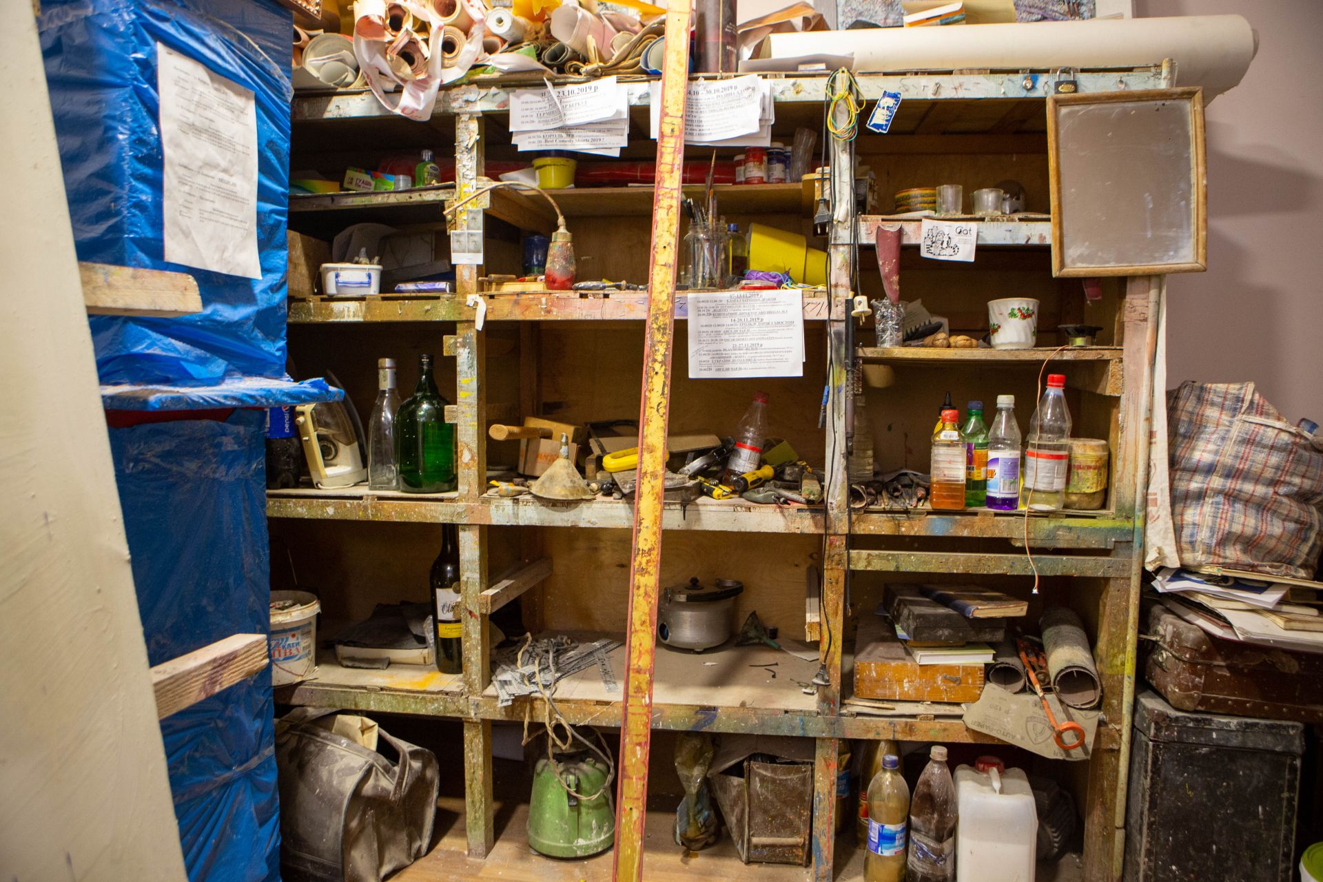 Майстерня художника знаходиться на другому поверсі кінотеатру «Родина». Над величезним мольбертом зі стелі світять дві лампи, стіл на стелаж заставлені баночками з фарбами та малярними кісточками.