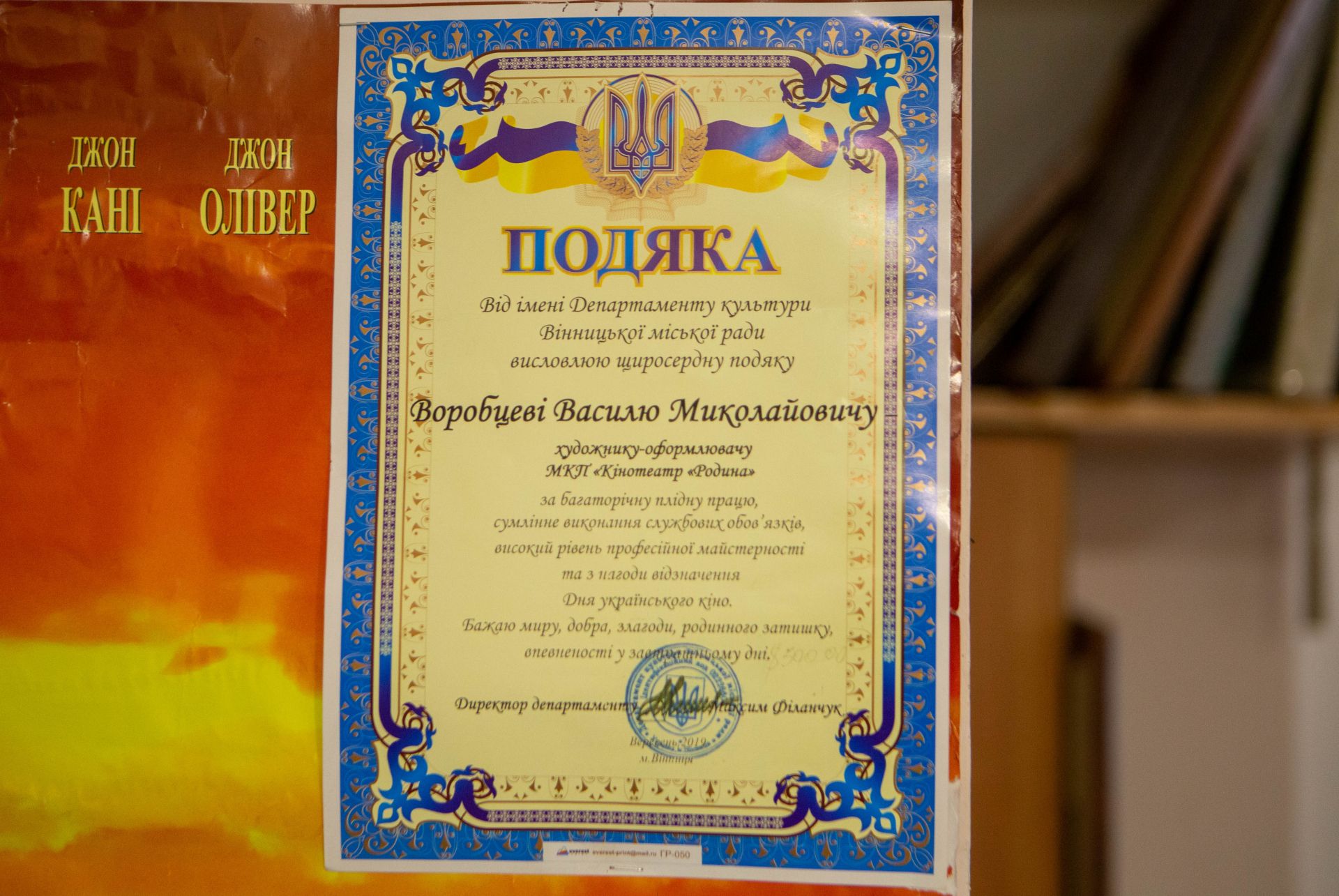 «Родина» — єдиний кінотеатр у місті, у якому до цього часу збереглись намальовані «від руки» кіноафіші. А художник Василь Воробець, заслужено може вважати себе «зберігачем» традиції. Він — одночасно найвідоміший і найневідоміший художник міста. На його полотна щодня дивились тисячі людей, а слава майстра давно вийшла за межі Вінниці. Хоч Василь Миколайович і соромиться про це говорити.