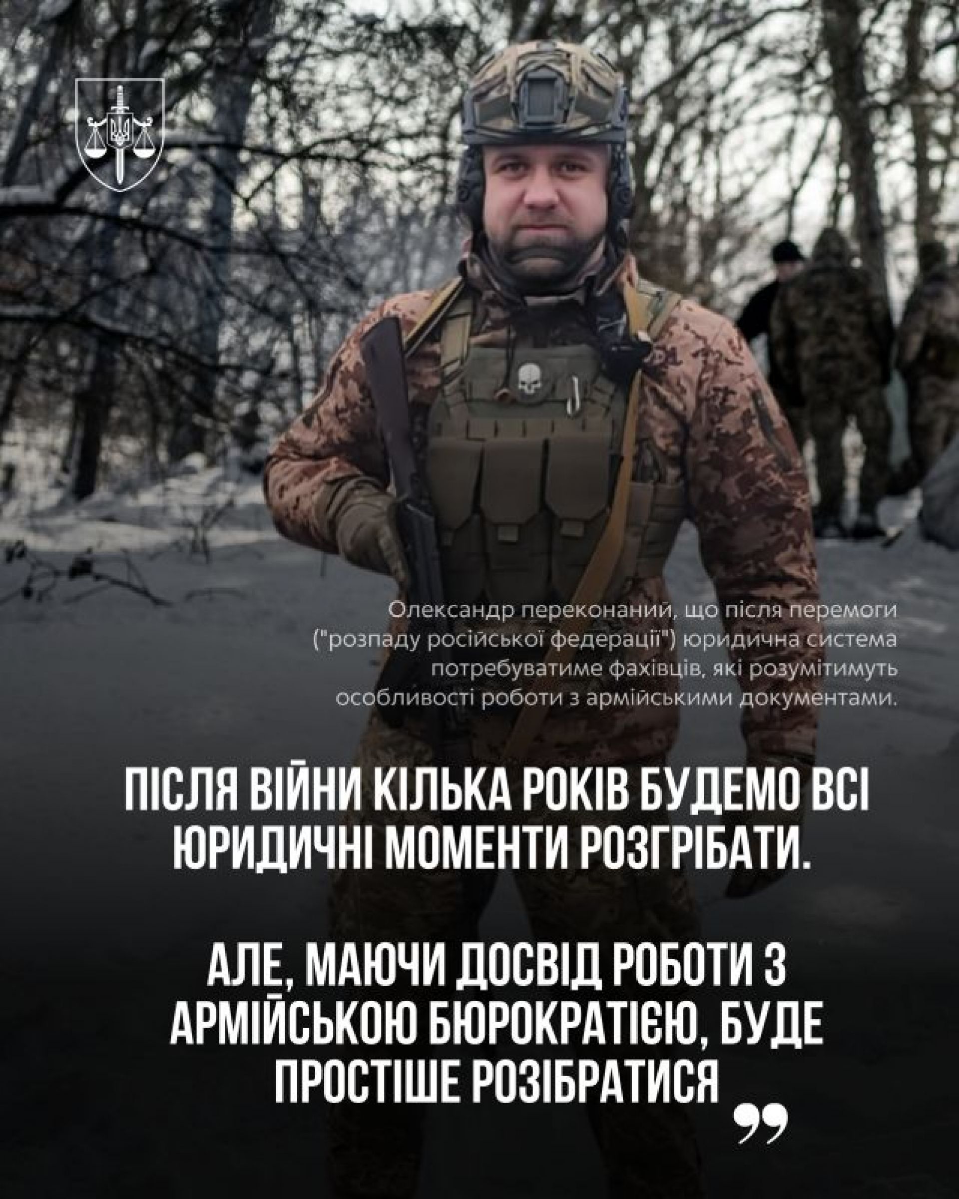 Олександр впевнений: після перемоги юридична система потребуватиме людей, які на власні очі бачили армійську бюрократію.