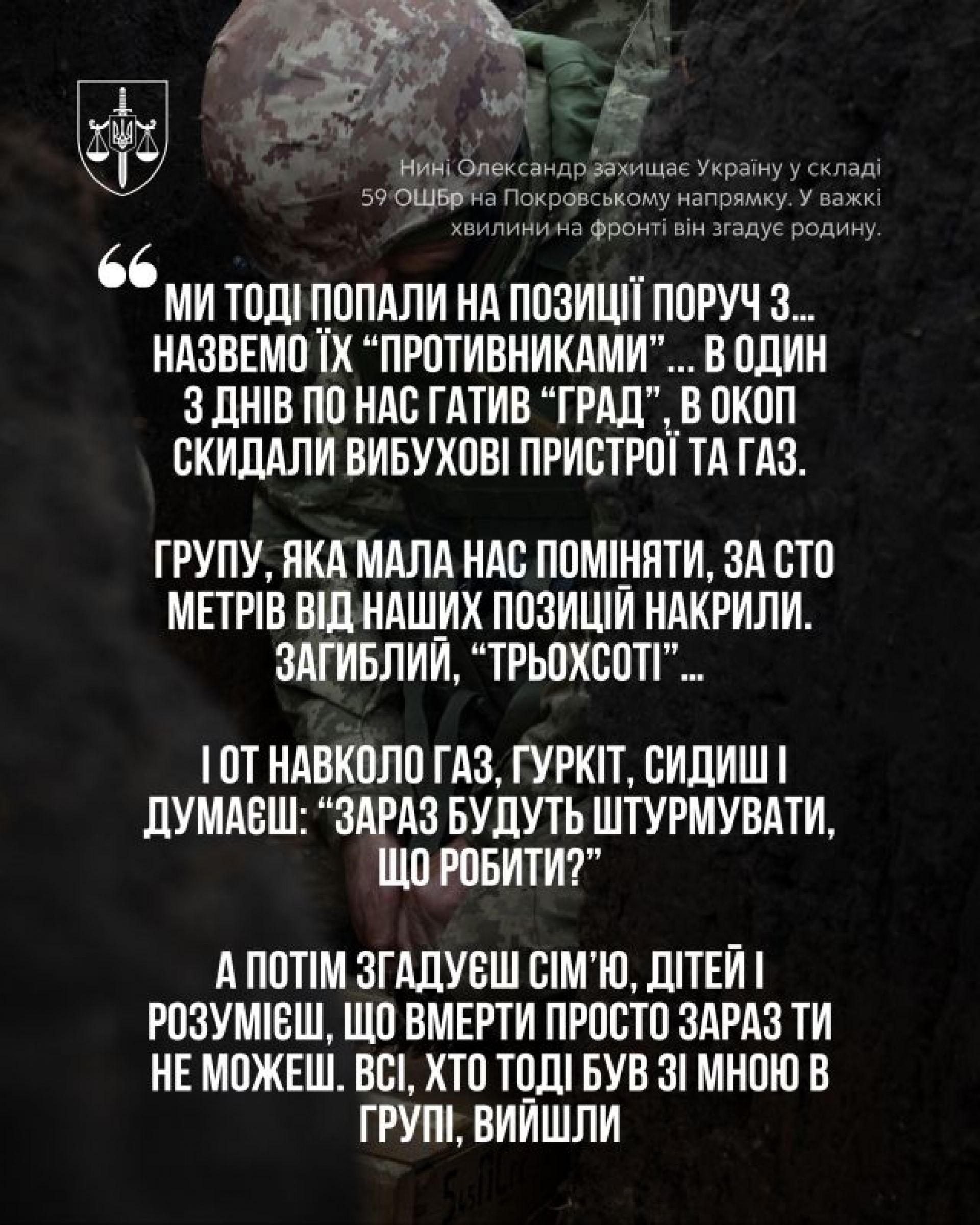 Найстрашніші моменти Олександр згадує крізь призму думок про сім’ю. Одного разу окупанти накрили їхні позиції «Градами», закидали окопи газом та вибухівкою. Коли навколо був лише дим і гуркіт, а ворог готувався до штурму, вистояти допомогла думка про дітей.