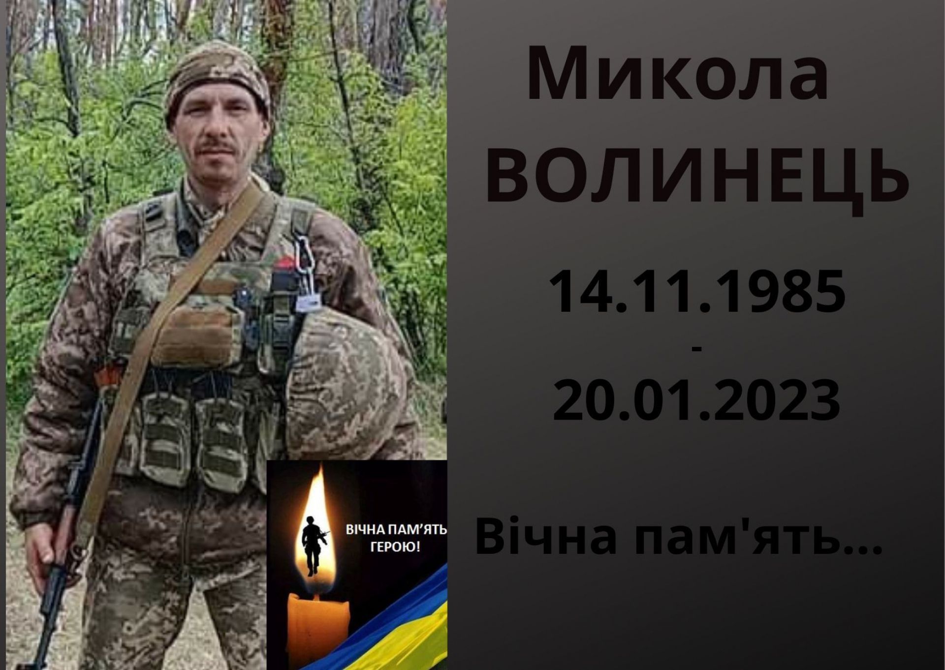 — На початку повномасштабної війни одним із перших пішов боронити Батьківщину. Служив стрільцем 3 стрілецького відділення, 1 стрілецького взводу, 2 стрілецької роти в/с А 7085, за сумлінне виконання службового обов'язку був нагороджений Подякою, — цитуємо повідомлення. — Висловлюємо щирі співчуття родині загиблого, поділяємо Ваше горе, сумуємо разом з Вами, підтримуємо Вас у годину скорботи. Нехай світла пам’ять про Миколу Волинця назавжди залишиться в наших серцях, а Бог дарує йому Царство Небесне та вічний спокій. Вічна пам'ять Герою України! Навіки слава!
