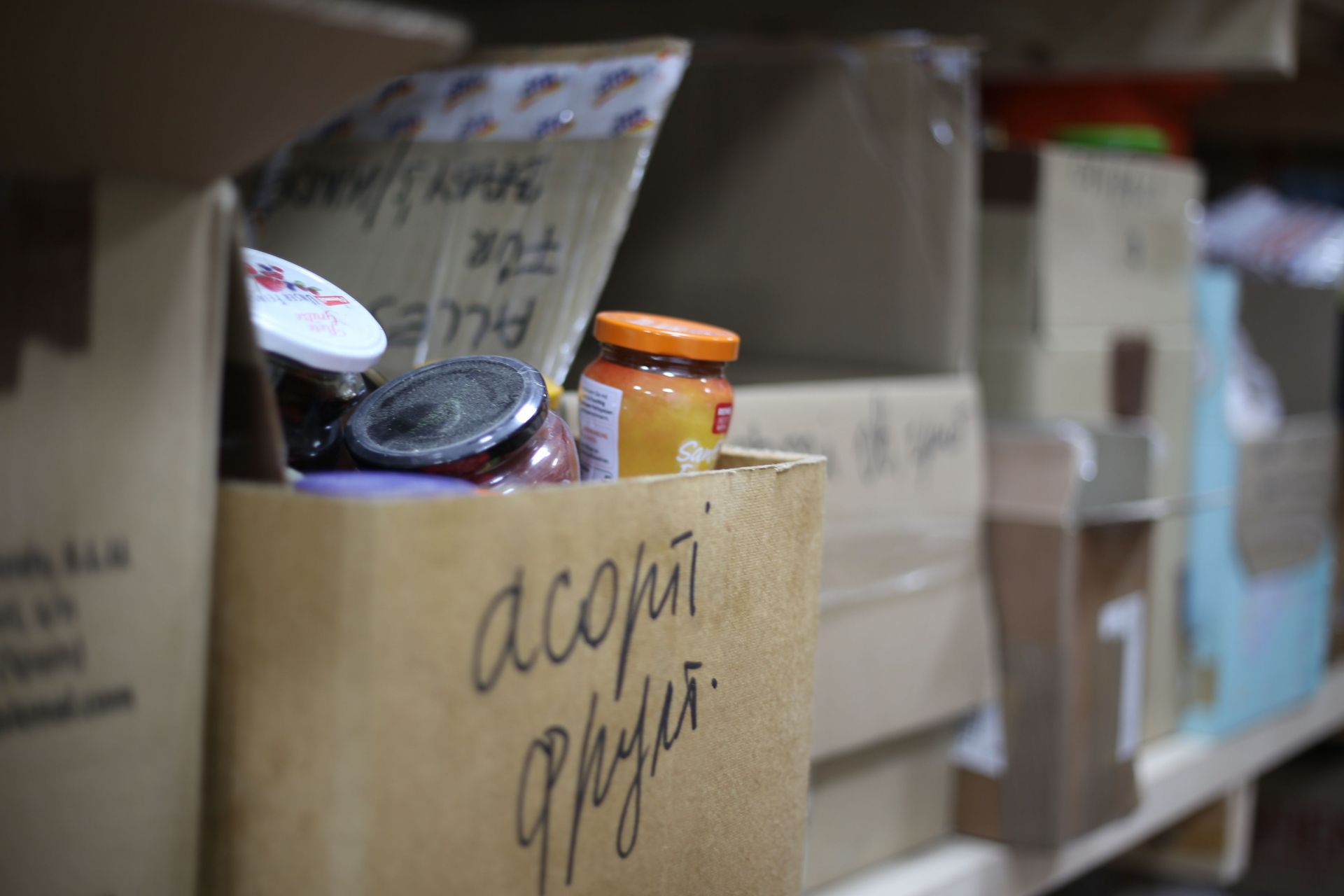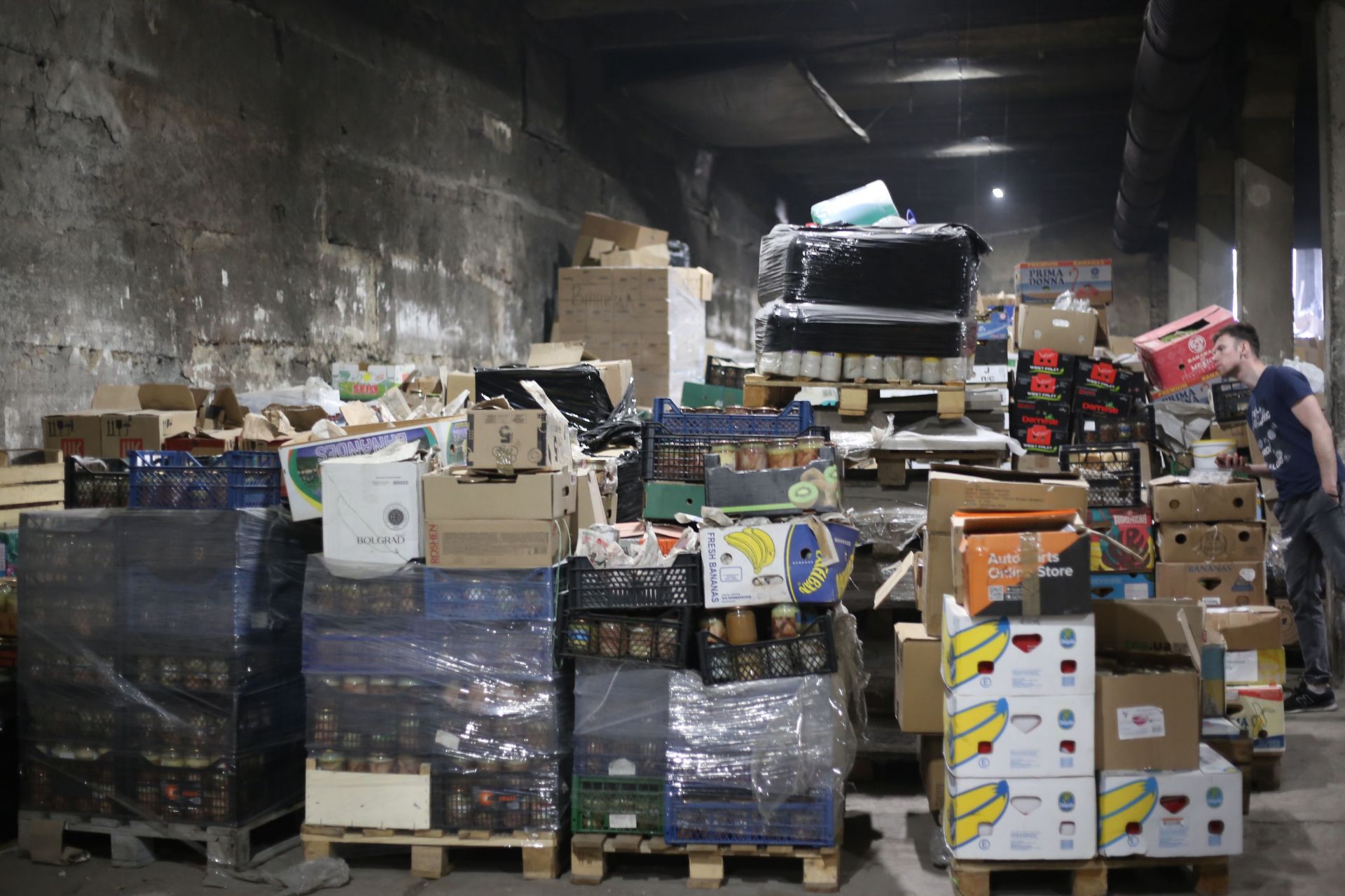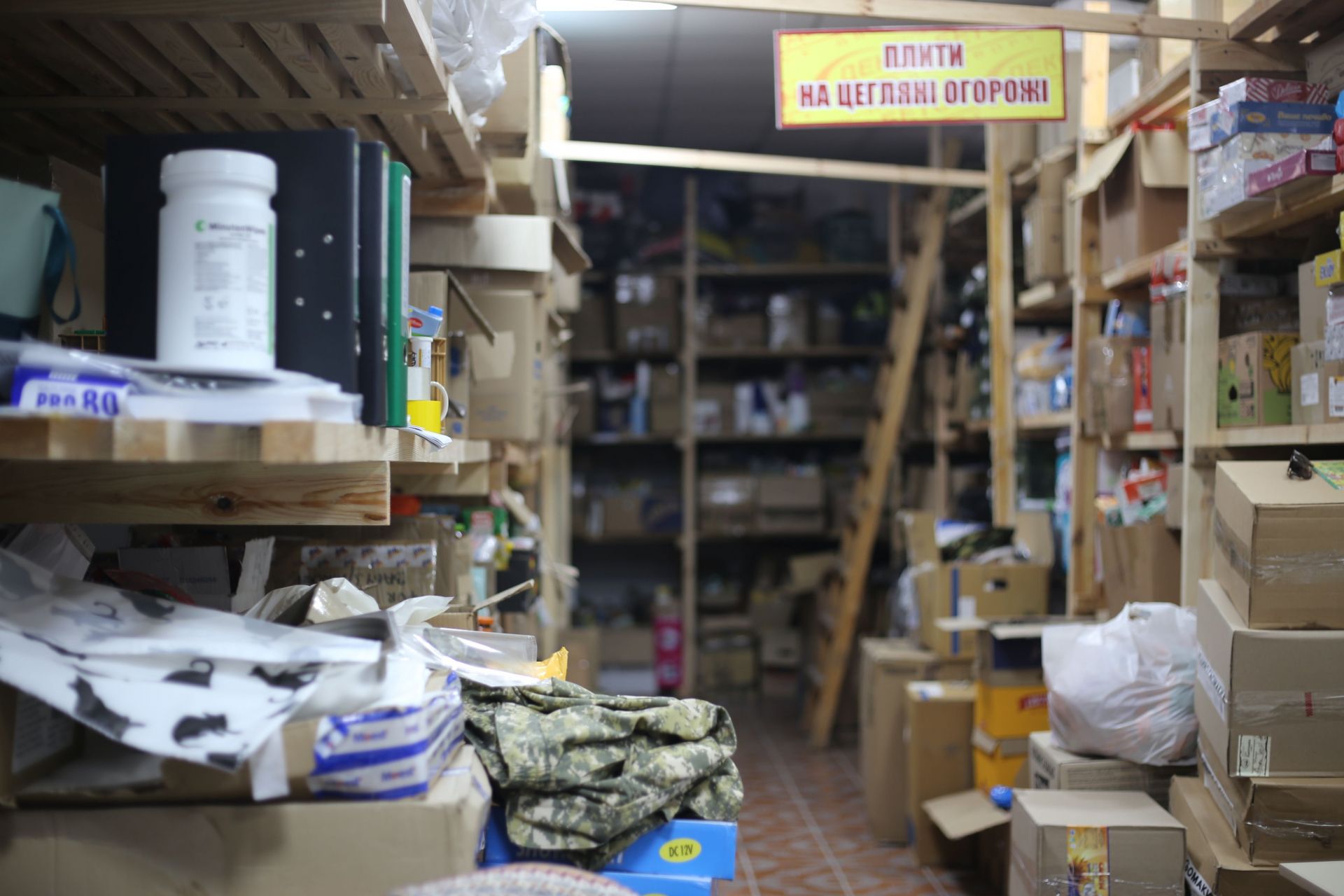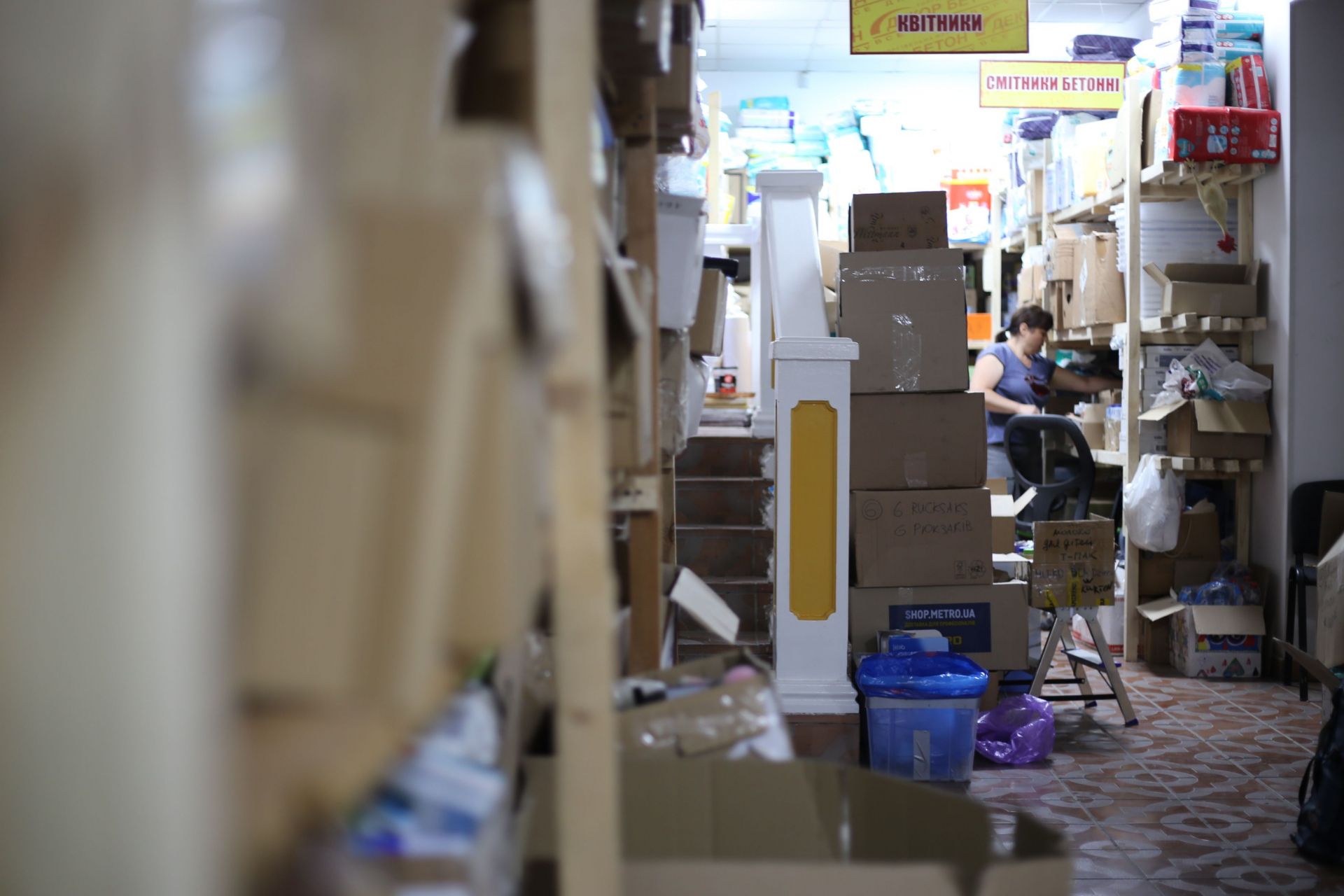 Ми стоїмо у приміщенні, яке ще три місяці тому було офісом та магазином торговельної мережі з виготовлення бетону. Зараз про ті часи нагадують хіба що вивіски-вказівники під стелею: «Квітники», «Смітники бетонні», «Люки» тощо. Тепер, куди не подивись, тут всюди можна бачити високі стелажі, заповнені цінним для воєнного часу вантажем.