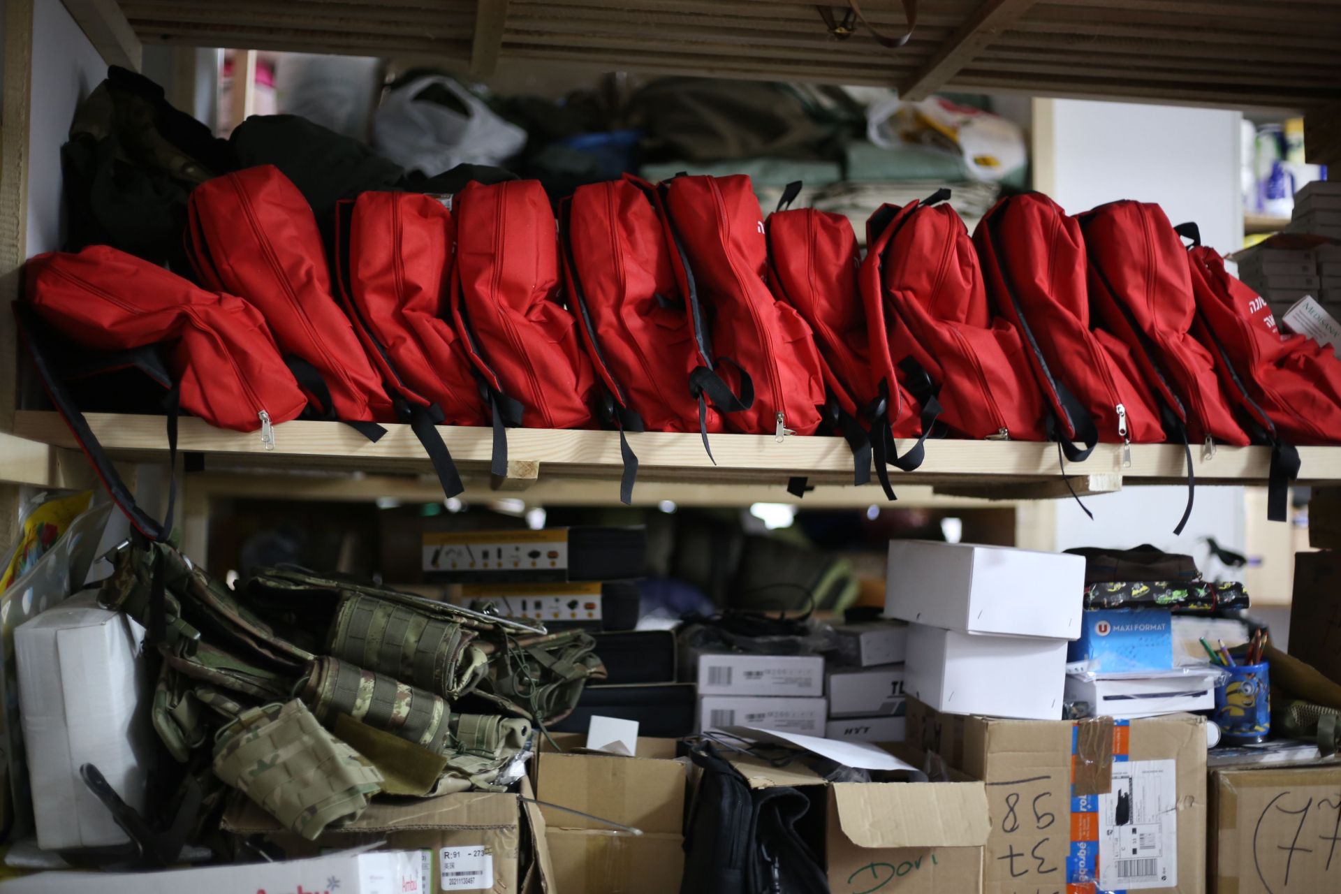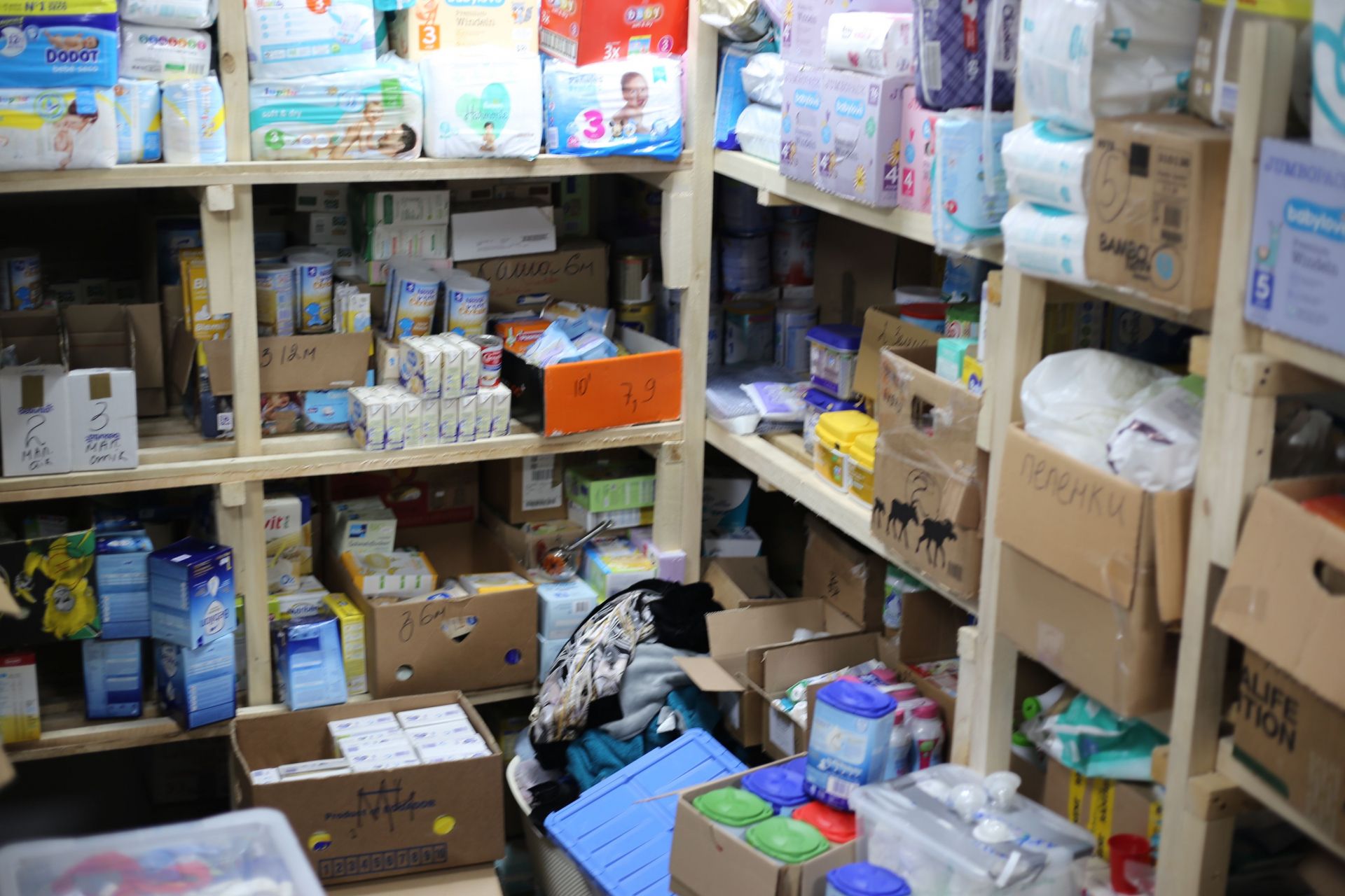 — Тут у нас харчі… медицина… одяг… дитяче харчування… гігієна… тактична медицина і все, що стосується тактики… — проводячи нам екскурсію поміж стелажів, розповідає Олександр Царевський. — Тут ліхтарики… взуття… плитоноски… каски… форма… спальники та каремати… термуха… рушники…