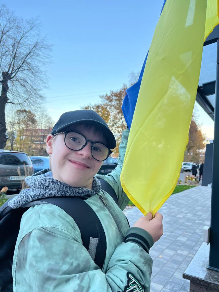 Світло після темряви. Артем тримає український прапор — символ того, що він не втратив віри, навіть після втрат і переїздів. Його усмішка — про силу серця й надію на мирне майбутнє.