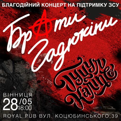 Легендарні Брати Гадюкіни розпочинають благодійний тур на підтримку ЗСУ. Концерт відбудеться у Вінниці, в Royal Pub (Коцюбинського, 39) 28 травня о 17:00. В програмі: виступ гуртів Брати Гадюкіни та Гуцул Каліпсо, що також можна буде подивитися за допомогою онлайн-трансляції.