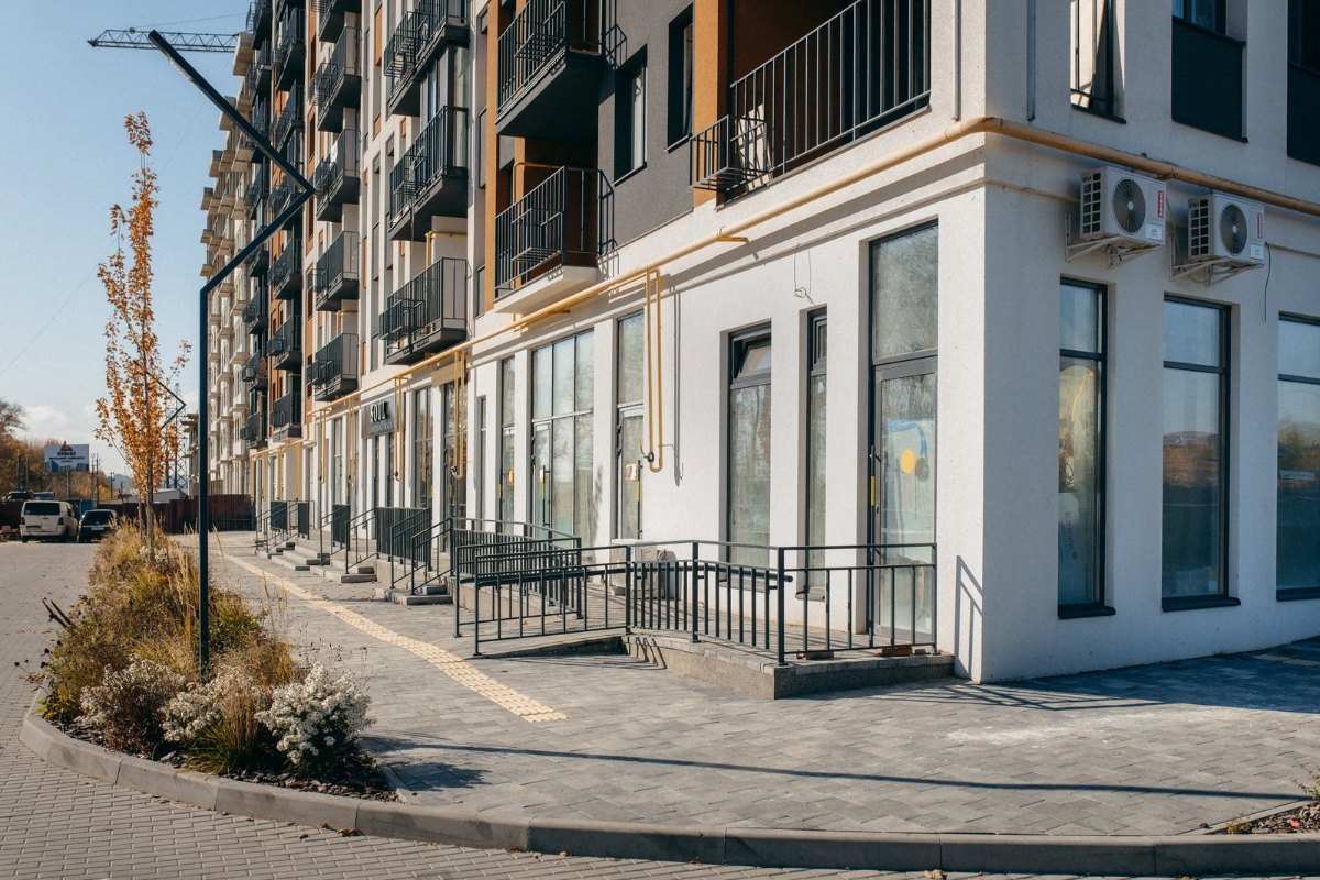 Комерційні приміщення комплексу спроєктовані під реальні потреби орендарів і власників: площі від 20 до 300 м², вільне планування, панорамне скління, фасадні входи, стелі від 3,5 м, заведені всі комунікації, паркінг для відвідувачів, безбар'єрний доступ для людей з інвалідністю і навіть власне укриття. Формат, який підходить однаково для кав'ярні, медичного центру, студії або офісу.