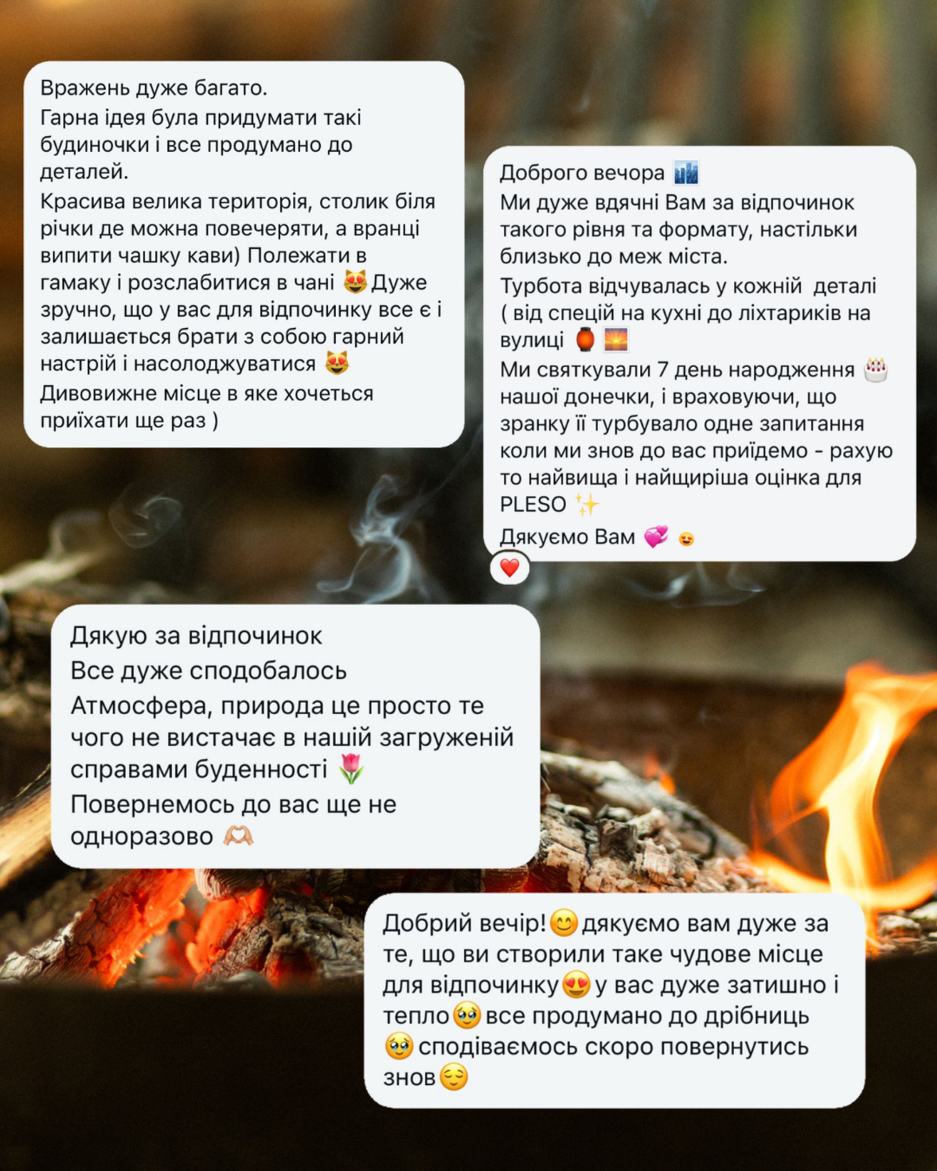 «Pleso — це те місце, де можна не поспішати. Тут немає гучних компаній поряд. Тут можна побути ближче до природи та разом з цим отримати все необхідне для комфорту, що ми маємо від цивілізації» — так говорить Вадим, один зі співзасновників будиночків. Здається, більш влучно і не скажеш.