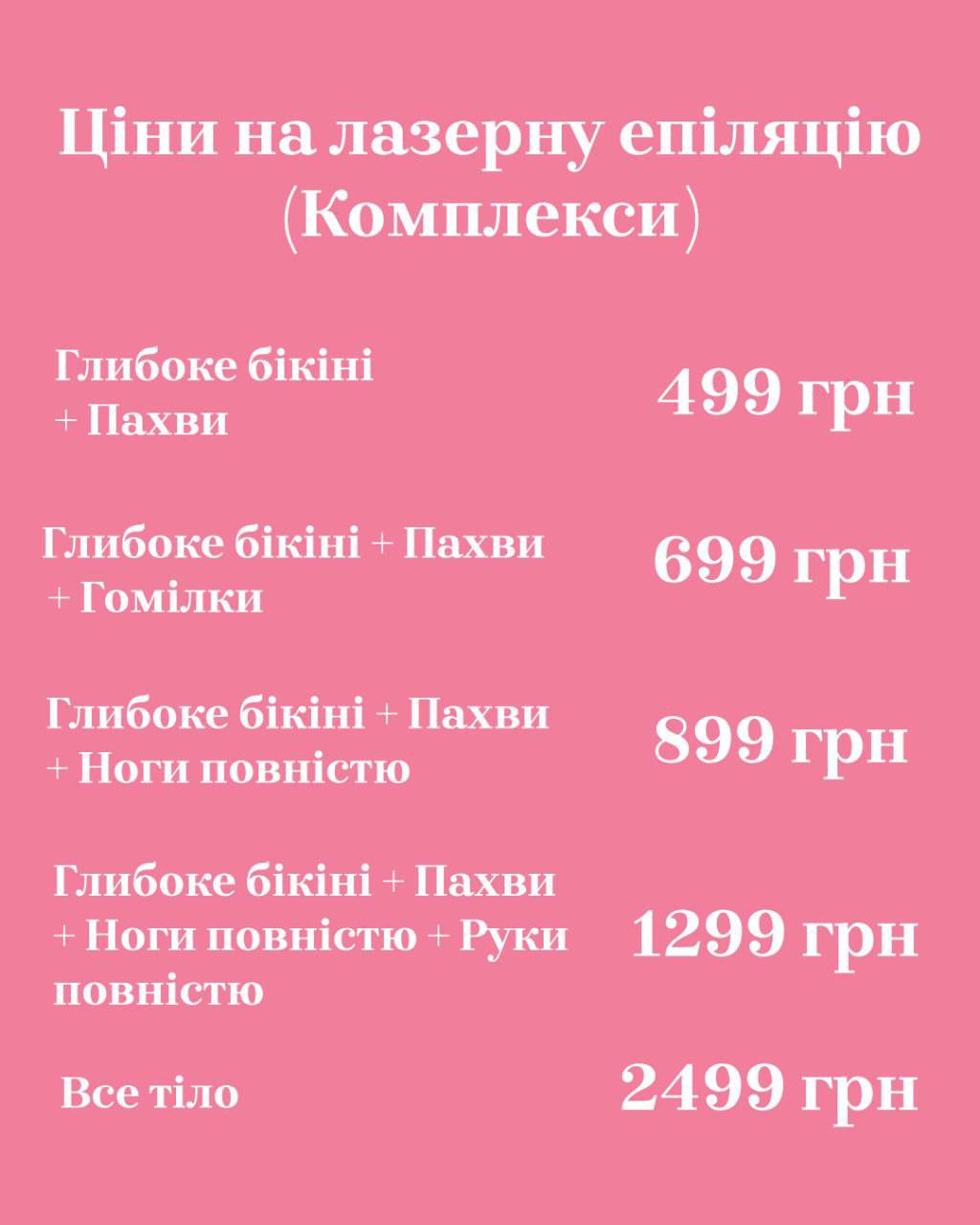 - Глибоке бікіні + Пахви + Ноги повністю – 899 грн;