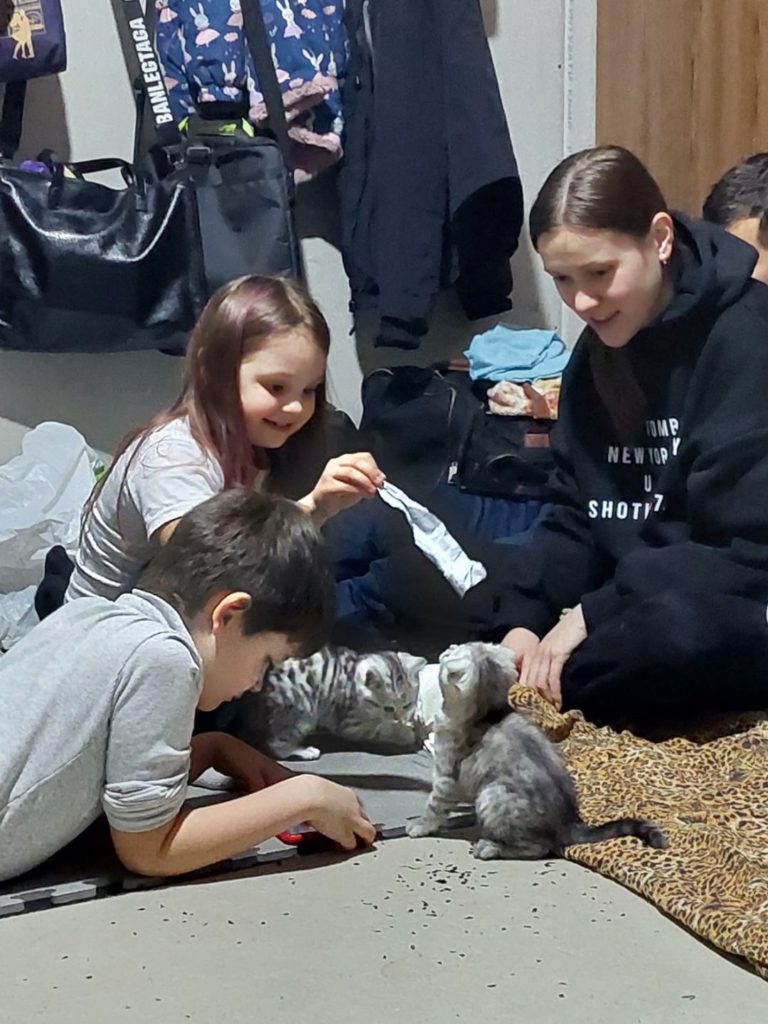 Момент тепла в укритті. Навіть у тимчасовому прихистку, далеко від дому, Рома з братом і сестрою знаходили радість — гралися з котиками, сміялися і на мить забували про страх. Ці миті тепла й простих радощів — як ковток світла серед темряви війни.