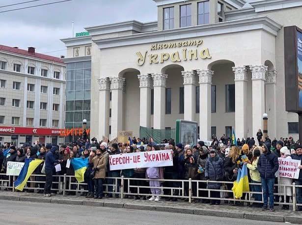 Коли весь Херсон каже «ми свої». Люди з українськими прапорами та плакатами — це Херсонці, які не зламалися під окупацією. Для Ксенії це був момент, коли вона зрозуміла: любов до рідного міста — сильніша за страх.