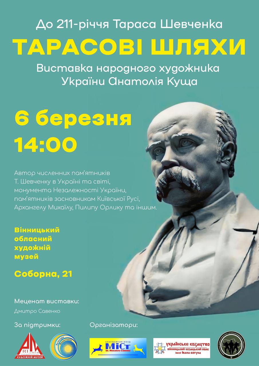 - 06 березня о 14:00 на відзначення 211-річниці від дня народження Тараса Шевченка Вінницький обласний художній музей презентує виставковий проєкт «Тарасові шляхи» відомого українського скульптора, члена Національної спілки художників України, дійсного члена академіка Академії мистецтв України, 2004 рік, заслуженого художника України з 1979 року, народного художника України з 1996 року, педагога Анатолія Куща.