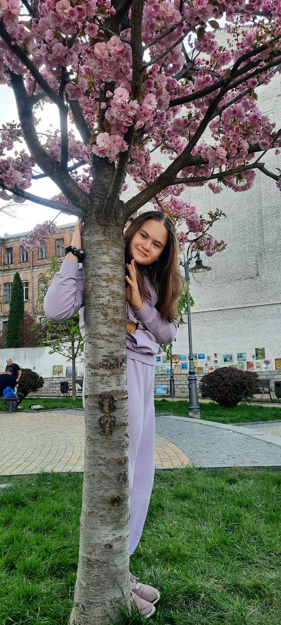 Анастасія біля квітучої сакури. Вона вчиться знову радіти весні — після втрати дому, рідного кота та друзів. Усмішка на цьому фото — вже не дитяча, але світла.