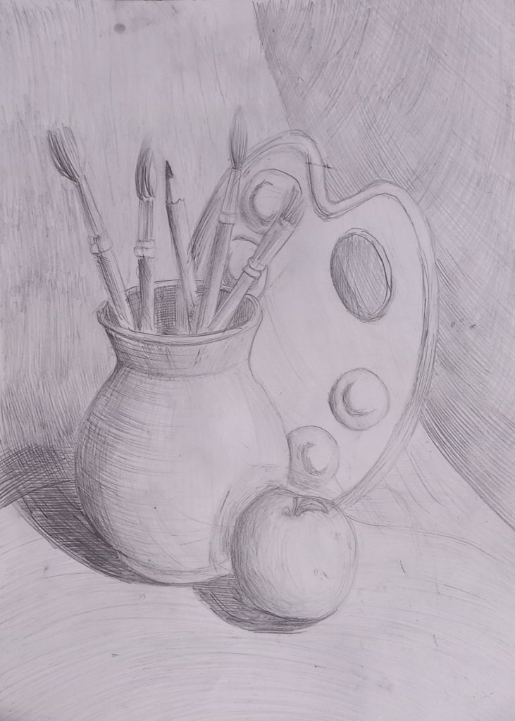 Уроки відбуваються онлайн — дівчинка малює олівцем, аквареллю, гуашшю, а зараз освоює акрил.