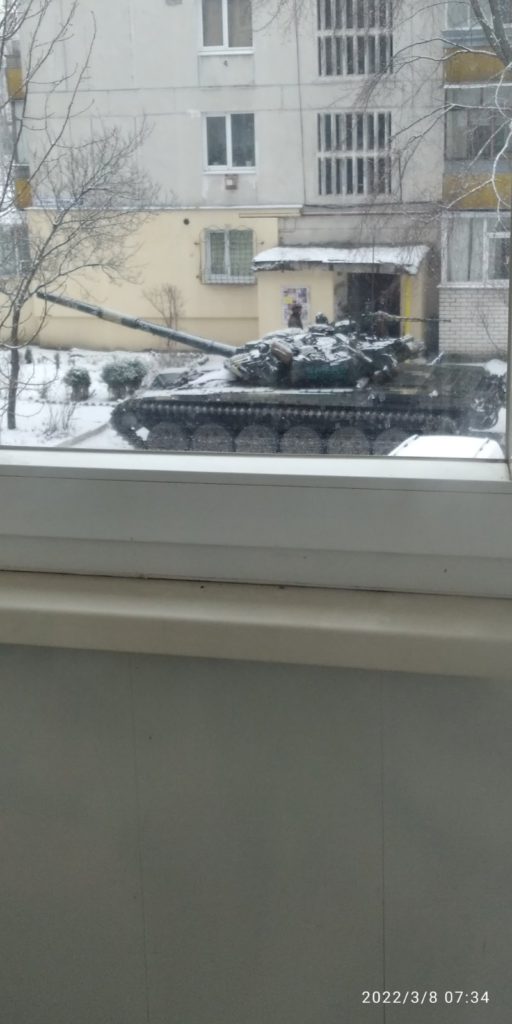 Війна просто за вікном. Цей танк Мілана бачила зі свого вікна. Це не фото з новин — це дитяча реальність. Війна прийшла занадто близько.