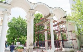 Наразі з колон арки вже зняли старе вапно, пошпаклювали та будуть фарбувати водостійкою фарбою. Декоративні елементи будуть відновлювати.