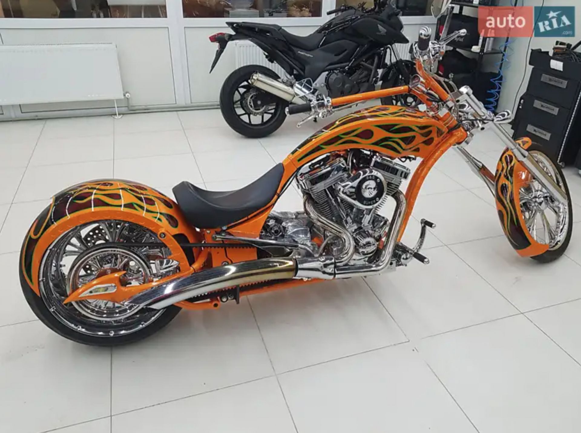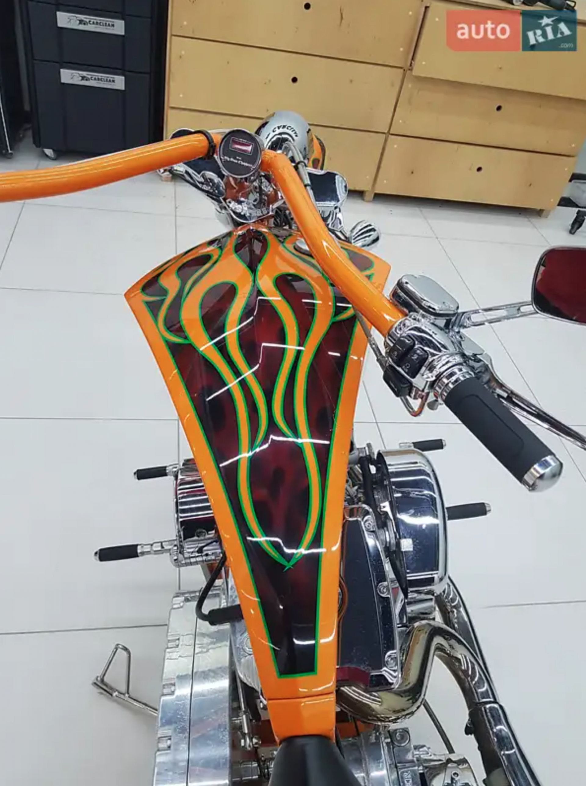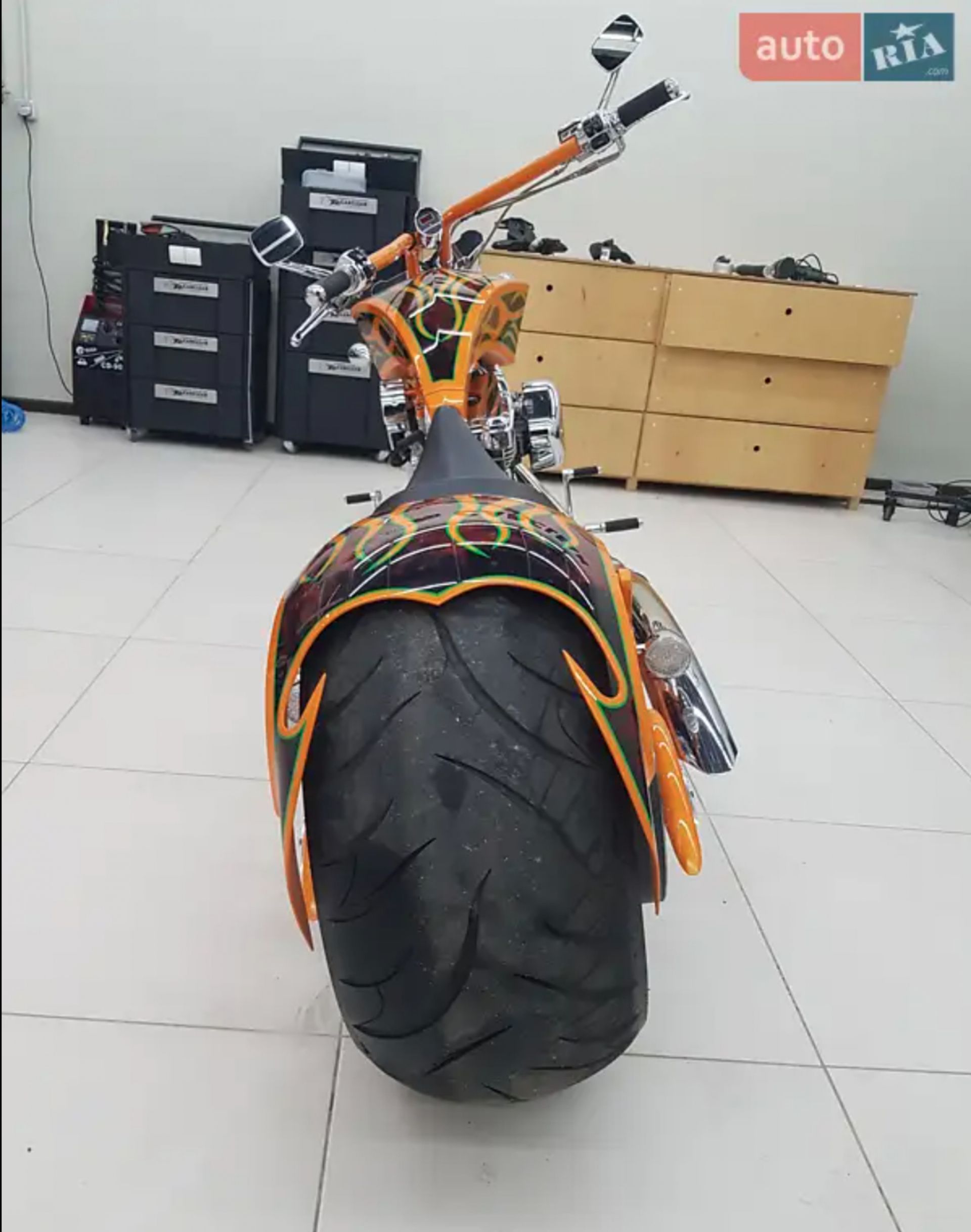 Яскравий кастом-чоппер, зроблений вручну і ні на кого не схожий. У нього потужний двигун, що дозволяє відчути, як він «хрипить» при натисканні газу. Унікальна рама із заниженим сидінням дає можливість сидіти низько, як у центрі машини — це додає управління та крутий вигляд. Велике заднє колесо, пружиниста підвіска і ручна 6‑ступенева коробка роблять їзду яскравою та агресивною. Це не просто мотоцикл — це вражаюча «машина для шоу», з яскравим дизайном і справжнім рок-н-рольним духом.