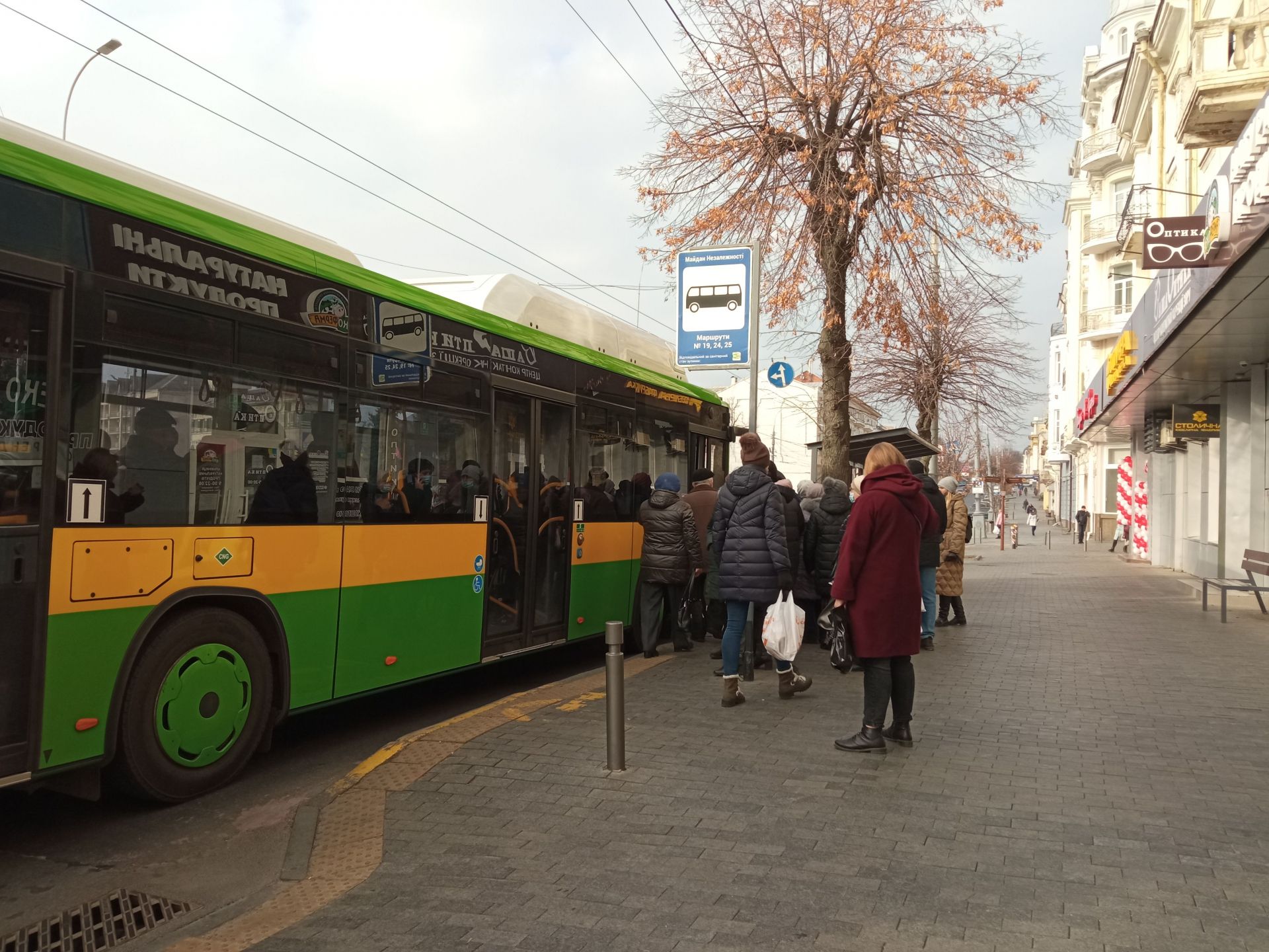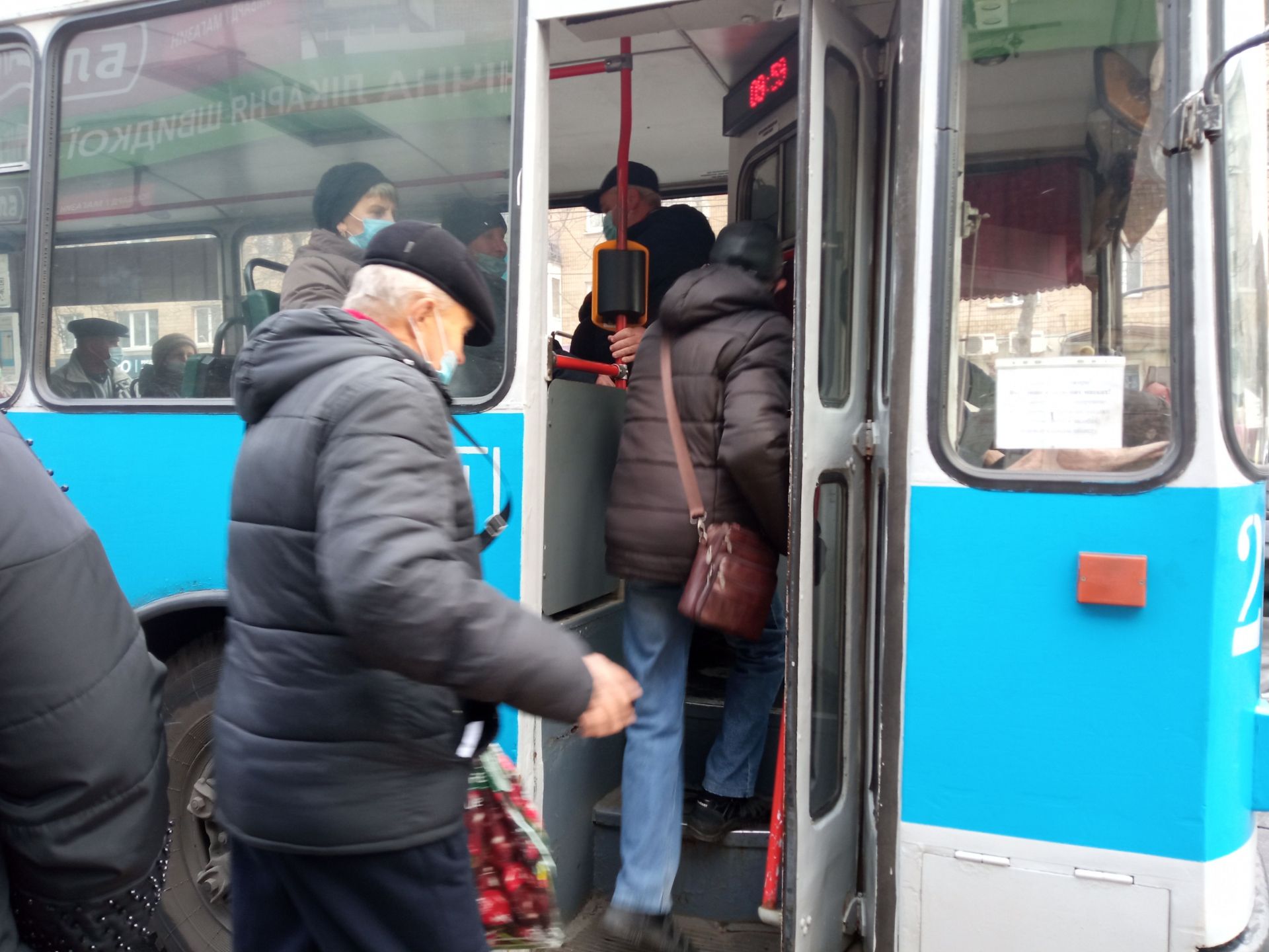 Власне, робота транспорту сьогодні не відрізняється від роботи вчора чи тиждень тому. На зупинках містяни шикуються у черги, перепитують один одного, хто на який маршрут чекає, і завчасно готують захисні маски.